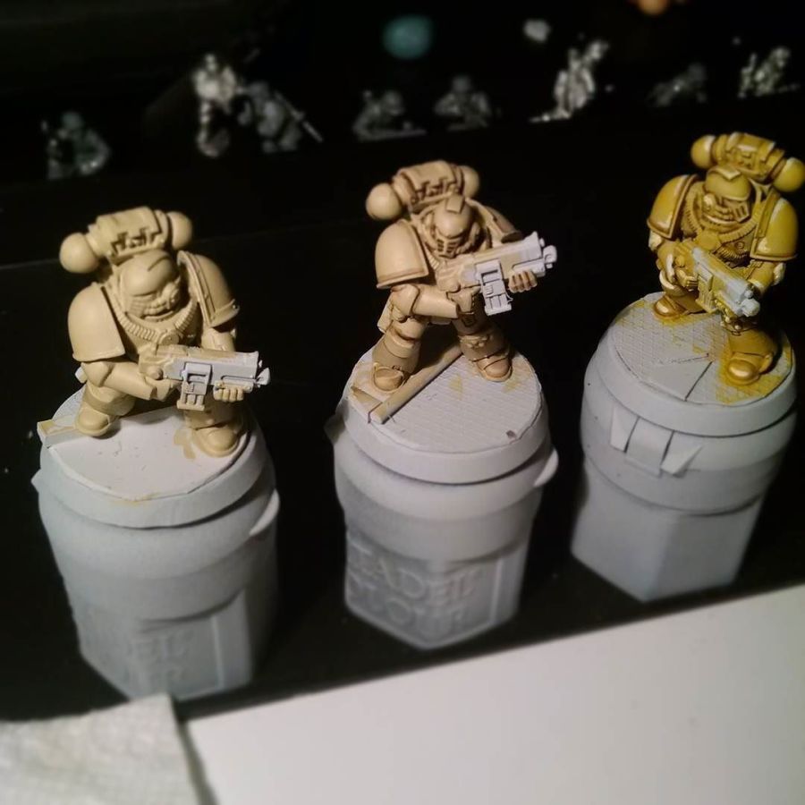 Working on the first batch of Imperial Fists. Started with a Corax White undercoat followed by two thin layers of Usabti Bone (model on left). Then an Agrax Earthshade line wash (middle model) and then a glaze of Lamenters Yellow. This was followed by a White Scar edge highlight (right model).