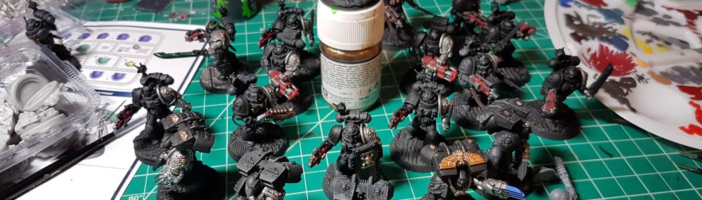 Here was my first pass. I opted for the tried and true Vallejo Old Gold for his back plate and his other shoulder pad, then a heavy drybrush of Basalt Grey and then a light one of Fenrisian Grey for the armor. The recessed areas were painted with a thinned layer of Vallejo Silver to help make them shine while preserving the bumpy texture of the figure underneath. After the base colors were done I got bored and decided to make a cool little display of all the dudes hanging out.