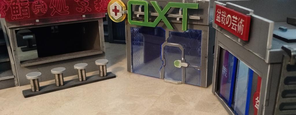 The commission composed of six separate buildings from various Neon City Panoceania and Neon City Yu Jing small building kits. As much as I like the look of the final product, I cannot recommend these kits to anyone.