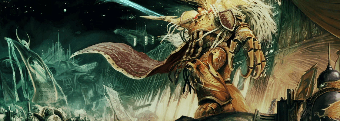 These are the vignettes of Belisarius Cawl, Inquisitor Greyfax and Saint Celestine. These are the three cards that were available during the launch of The Gathering Storm: Fall of Cadia. The interview only went into detail on Cawl and Kevin wanted to show a “very merciless side of him, blood dripping from his ax”. An interesting point, for this artwork Kevin had already seen the fully painted models and was tasked with bringing them to life.