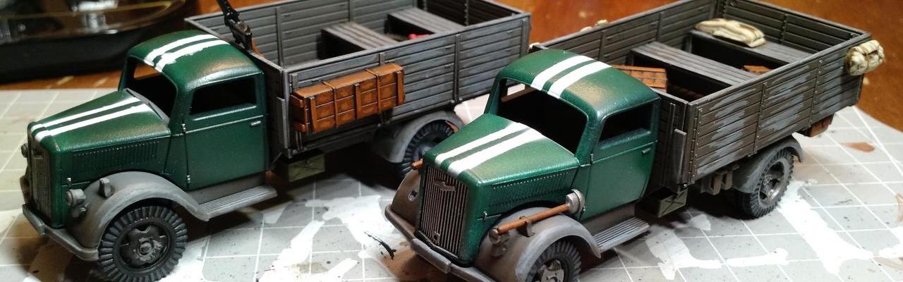 The trucks themselves are based on the Opel Blitz trucks used by partisan forces during the Warsaw Uprising. I stuck to the classic gray color scheme and added stowage both inside the truck bed and on the side to break up the solid color. Of course, the one thing that is not based on history is the truck cabin painted in racing green with a pair of white racing stripes. This shift from the norm is to match our Partibus display board and to bring more life to the Partiboys theme of the army.