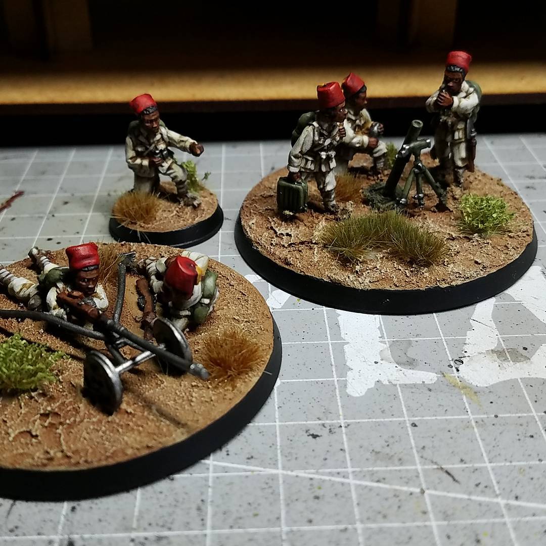 I finished the medium mortar, spotter and anti-tank rifle team. The simple headswap from the Warlord Games Italians to the Gripping Beast Senegalese tie these support weapon teams to the rest of the army. I also built the second squad of colonial troops and cannot recommend the Empress Miniatures Askari enough. Next up is added the Vallejo Dark Earth texture to the bases before priming.