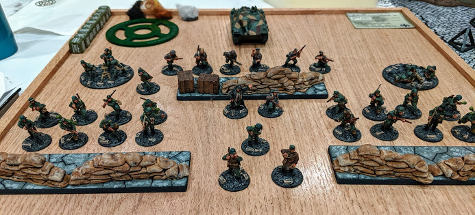 My fourth game was against Jeremy’s gorgeous German anti-air force (pictured above from one of his other games), which included autocannons on armored chassis (which are great at chewing up veteran infantry) as well as inexperienced/green infantry units. We played on Tom’s gorgeous China table (which won Best Battlefield, well deserved!). Jeremy and I were dealing with four objectives, each of which would (potentially) give a bonus the first time a unit approached them and opened up the supply canister. Other than that it was a classic objectives game, hold more than your opponent at the end. Early on I rolled up on one objective and it turned out that it was worth 3 points instead of 2 in the endgame, so I started to consolidate to attempt to hold my two objectives rather than overextending towards. My howitzers and light mortars continued to perform, knocking out several team weapons and adding pins, while my British artillery observer delayed his enter center early in the game with pins as well. I got a bit unlucky when hitting his Green units, as casualties I caused bumped 3 of them up to regulars, greatly boosting their effectiveness. The game ended up coming down to whether we had to play Turn 7, as I managed to effectively stop his push on my right side and on the left I used an Airborne squad as a roadblock to prevent his tank from contesting my objective in turn 6. Unfortunately for me, we did roll to have to play turn 7 and despite landing several hits from howitzers and the AT gun I was unable to knock his tank off of my left objective and he took the 4-3 win on points. A very good game and a hard fought loss.