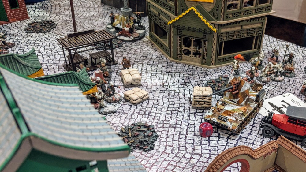 There was a single central objective in Dusk Assault. This was a highly variable game in which it could potentially end at the end of Turn 4, or could last until Turn 8. Our objective was to capture and clear the central objective until dusk. After Turn 4 you would roll to see if it became dusk each turn (causing limited range/visibility for your units) and bringing you into the endgame, where a player controlling the objective uncontested could win the game on a roll of a 3+ at the end of a turn. John was running Germans with a worrisome choice of armor, including both a Panzer IV and a Marder III (pictured above from one of his other games), which wields a heavy howitzer, an easy way to delete my veteran Airborne units. I decided early that the Marder was my primary threat and deployed my AT gun to deal with it. I landed my first shot on the Marder and was able to destroy it, opening up options for my infantry to advance. I found myself in a good position when dusk set on Turn 4, with a squad holding the objective uncontested, but his Panzer IV raced up the road and blew them apart with an HE shell, forcing me to run one of my light mortar teams onto the objective to contest it and avoid a loss. Over the next few turns the Panzer IV continued to cause a bit of havoc in my infantry, but I was able to eliminate the rest of his army and take the win with a controlled objective.
