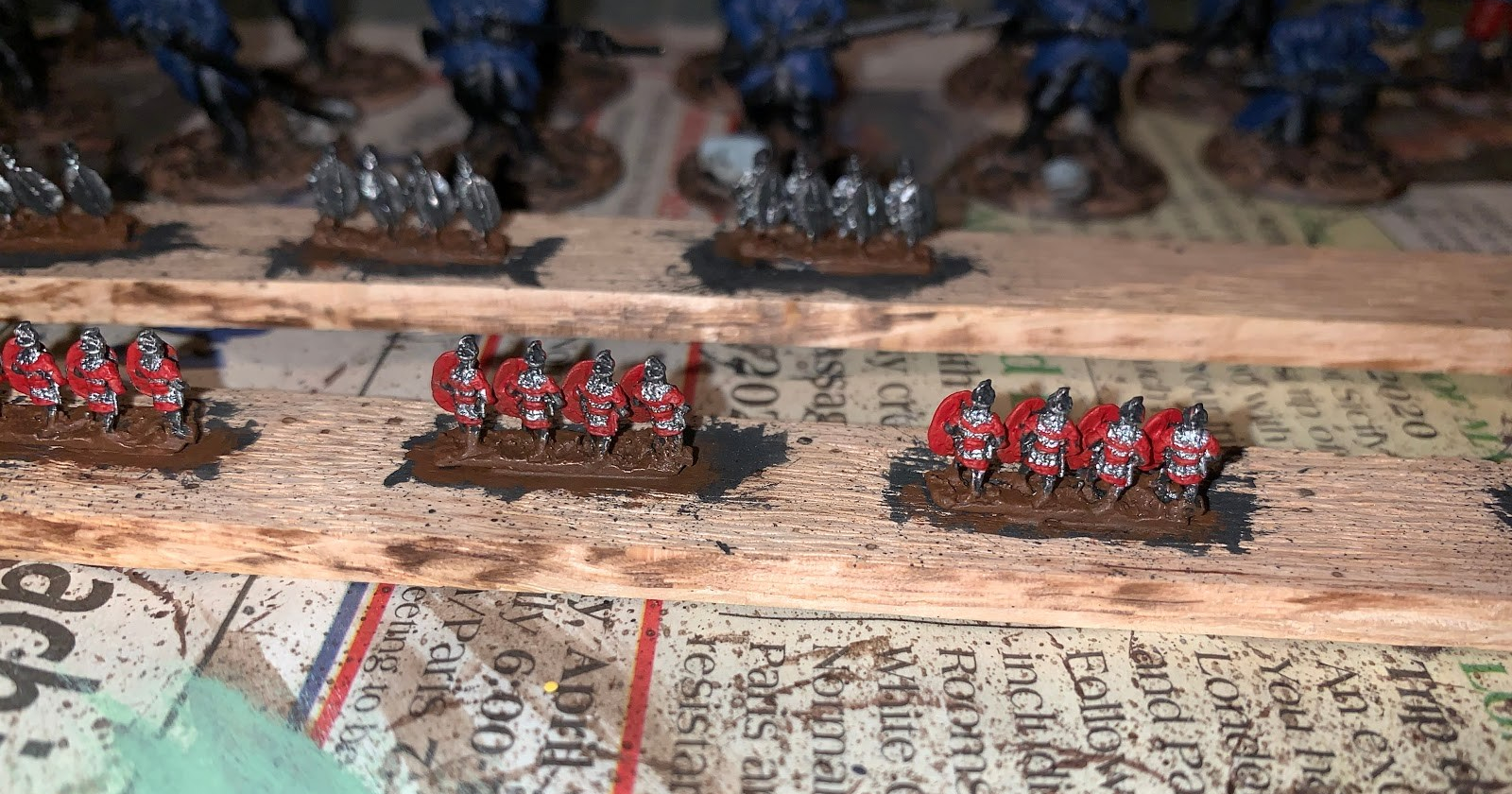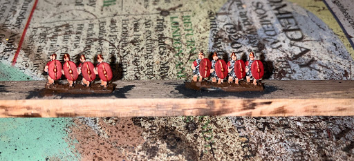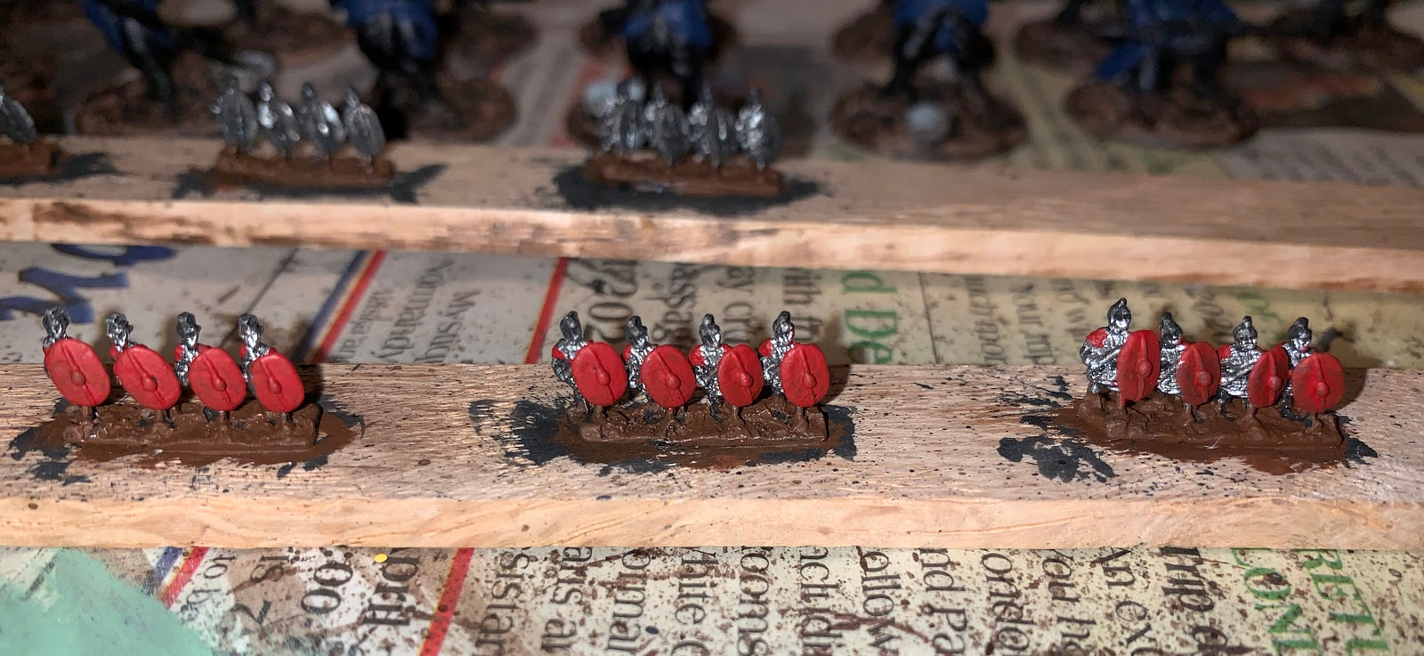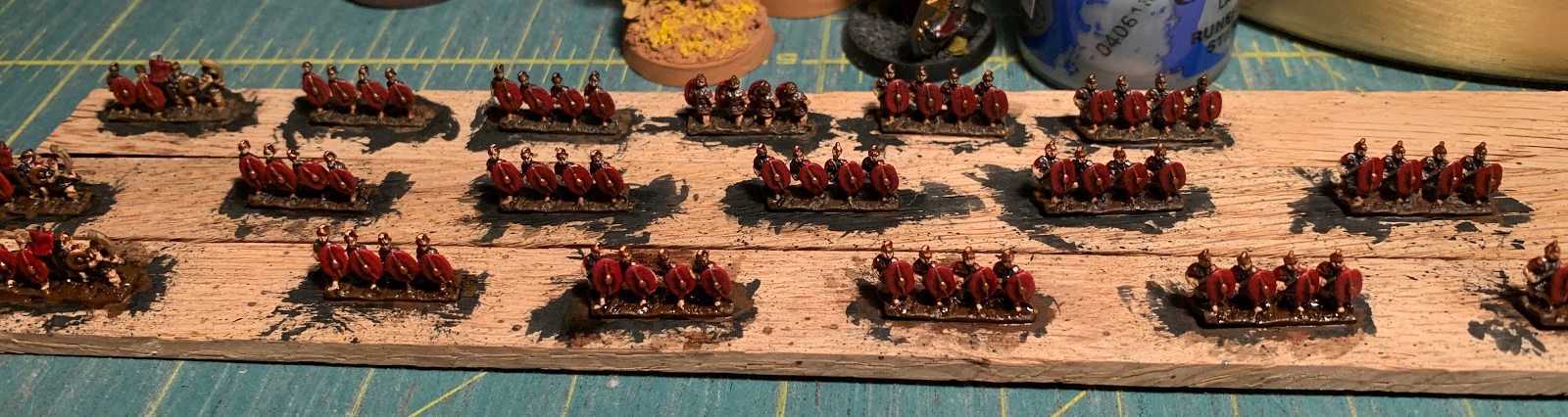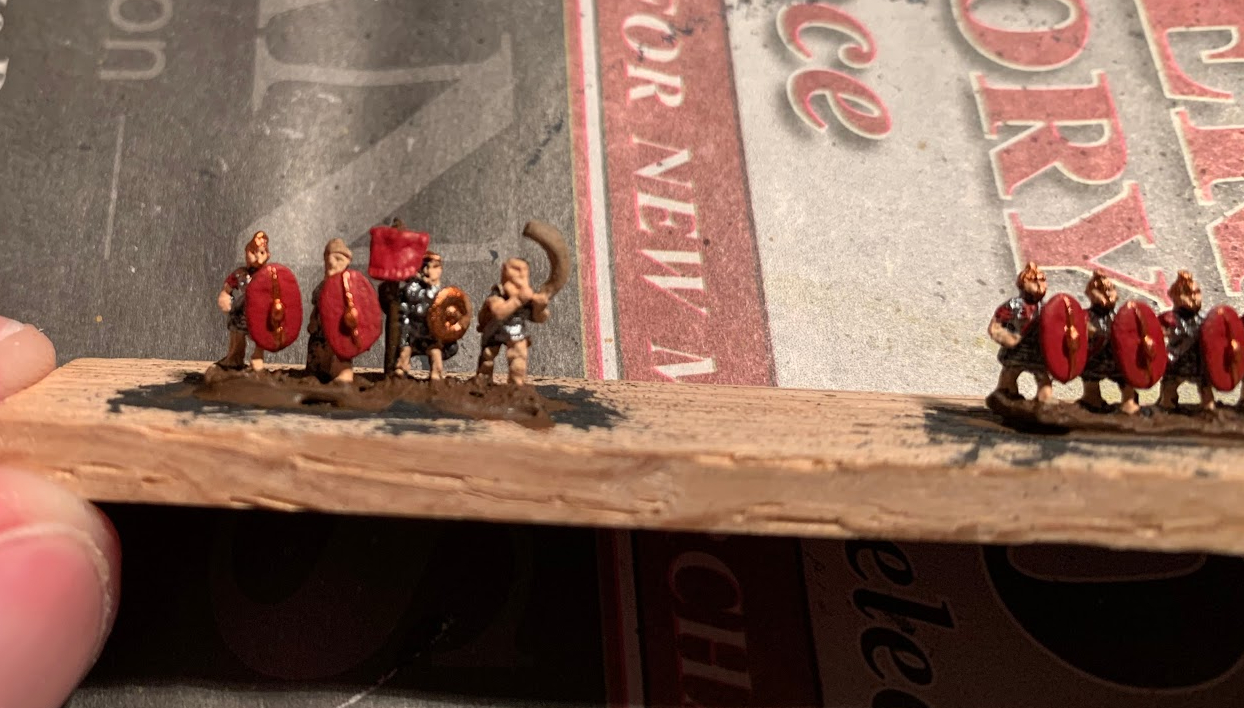 Fast forward a few months and I am now finally getting around to painting up these miniatures and I must say I am enjoying it immensely. Between the rapid speed at which they are completed, about an hour (from start to finish) per stick, and the awesome look that they give when all arrayed on the tabletop, I think I may be painting 6mm miniatures for many years to come. Also, one cannot speak about 6mm wargaming without bringing up the cost, for it is far far less expensive than any other miniature wargames out there and with the likes of Bacuss and others there are plenty of high quality manufacturers to choose from. But I will save my general thoughts on 6mm wargaming for a different article. Rhis is an article about the start of my legion! So without further ado I present you some in progress shots of my first bunch or Roman Legionaries.