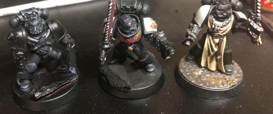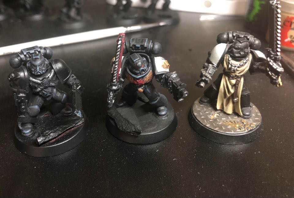 A few Astartes at various stages of test painting