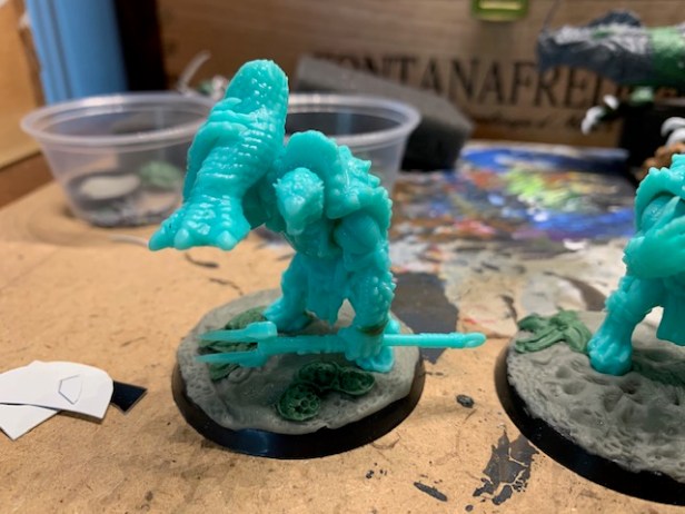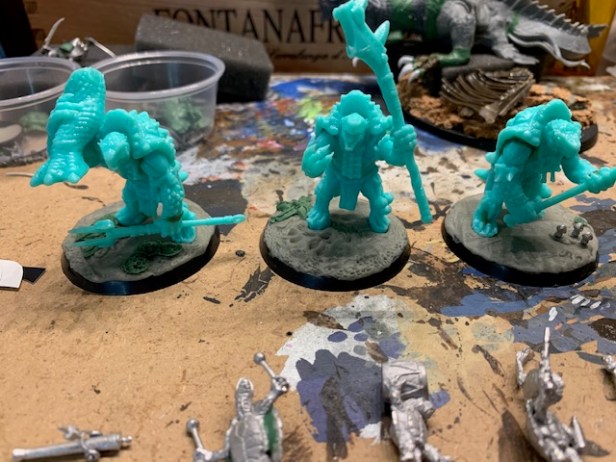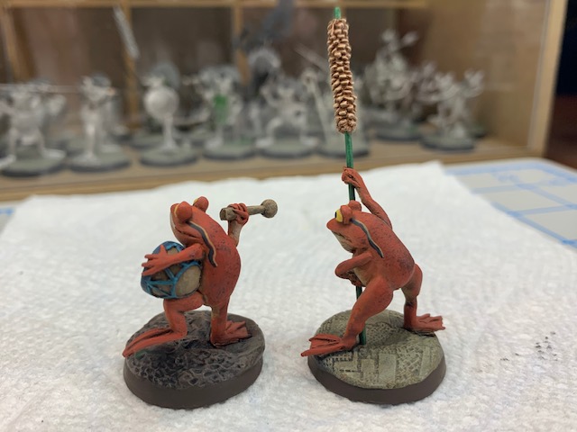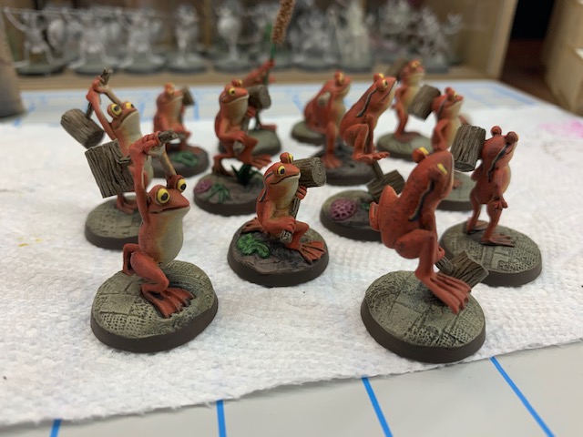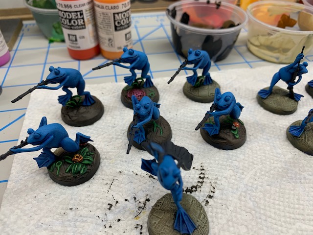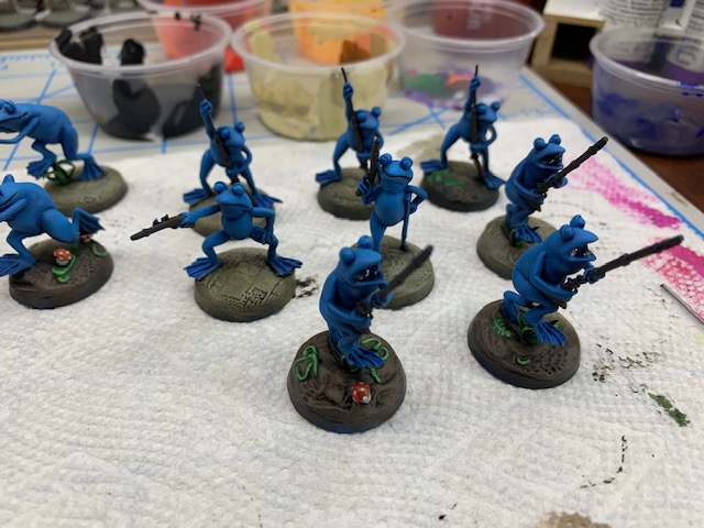 Frogs are wet. All the frogs will be getting gloss coated once more batches are completed. The non-glossy parts will get painted matte. I typically base armies once they are all painted, so that will be at the end of this project.