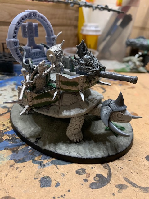 Cera is a Great Turtle Battlewagon and named after the triceratops from the Land Before Time. Brave little terrapins crew the howdah; armed with black powder and mystical fire. The model is ambiguous in that it can be two different units in the game. The horns, side “flame” cannons, and large main cannon can represent a mighty Stegadon in the game. Or the heavily armored shell, main cannon, or underwing Asp Rockets can represent the dense Bastiladon with its solar engine or snake filled Ark of Sotek.