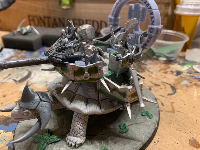 Her entourage is three Big Snappers. They proxy as Kroxigor units in the game and are the body guards to the little lizards. They can go toe to toe with anything in AoS and constantly surprise me with their damage output. The Big Snappers will be getting the classic green skin TMNT look as well as the smaller terrapins. I settled on a Leopard Turtle shell scheme for all shells. The howdah is going to have a chipped red paint look. Thinking like painted pirate ships.