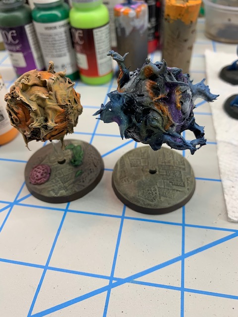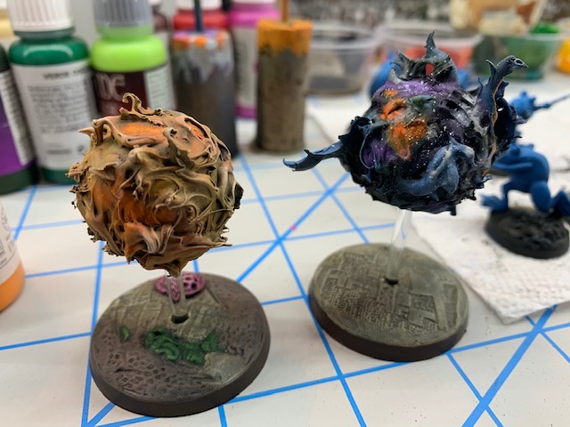 In practicing with the airbrush, I finished some Endless Spells. In the Age of Sigmar world, armies/wizards can upgrade their arsenal with special spells. These look cinematic on the battlefield and can be quite potent. These are “bound geminids”, and they must never move more than 6 inches apart from each other. The “light” and “dark” orbs each do different effects on the enemy. Sticking with the cosmic vibe, these frogs are spitting dark nebulae and bright suns on the foes of the pond. They were made with super balls and hot glue.