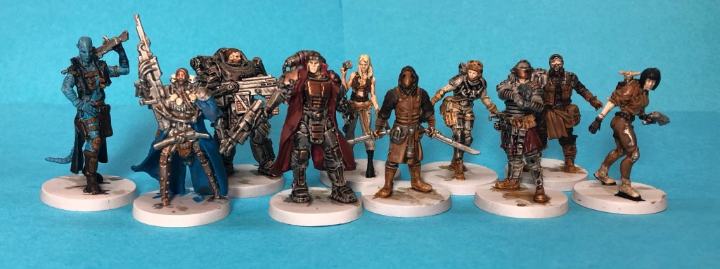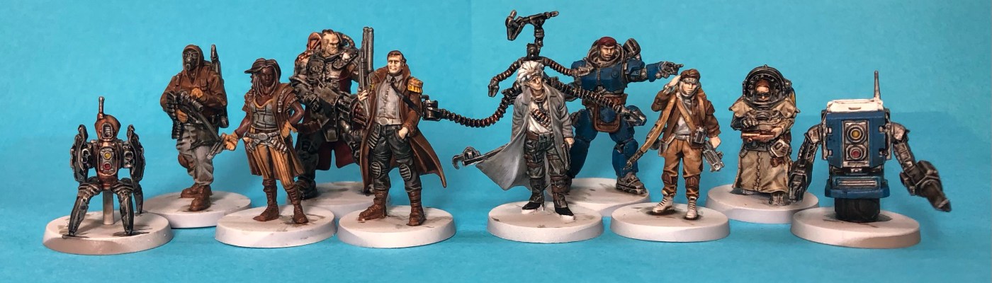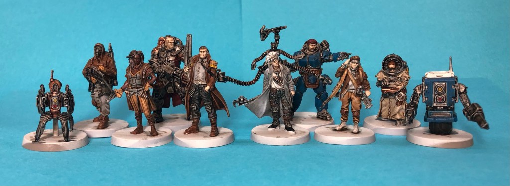 For my second Crew, I haven’t sorted out the best Captain and First Mate for this Crew. Well, that isn’t entirely true, I’m pretty sure that the big guy with the Bronze power armor and the maroon jacket will be the Captain but I’m not sure who is First Mate is yet. I’m leaning towards the mysterious Katana wielding masked man. He reminds me a bit of Morgan’s character from the Walking Dead. This crew has several other lightly armored models but is backed up by a buff “Not-Judge Dread” and another solider decked out in power armor and nasty looking rapid fire gun. The only Alien in either crew is also featured here. However, my favorite model in this crew is the Robotic sniper (blue cloak). He strikes me as a ruthless bad-ass.