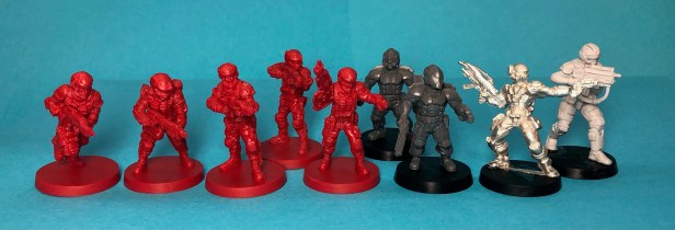 Joseph describes the Pirate Troopers as “Standard baddies in heavy armour with carbines”. For my Pirate Troopers, I’ve selected five models from Star Saga (the red ones) which I think are perfect. I added four other miniatures to this group in case I need to bump up the number Pirate Troopers needed for encounters. The pair of gray plastic models were from a plastic frame I found in my bits drawer. I have no idea what line they are from but the look fits the Pirate Trooper description well enough! (For those miniature detectives out there the plastic frame was stamped “Spiral Arm Studios LTD 2015” and I suspect they were an Adepticon giveaway from around that same time frame). The metal model is a MERCS miniature that I received at Adepticon many years ago. The last model in this group was from CMON Project Elite. I’d already primed this model as it was included in my “extra” models from last month’s blog update. I ended up needing to re-base this one because the Project Elite models are on 40mm round bases. While the aesthetics of the last four don’t match the first five completely, I’m sure that I can make these work, even painting them as rival Pirate factions if necessary!