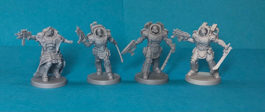 For the Pirate Shock Troopers, which Joseph describes as “Elite baddies in combat armour with carbines”, I decided that these four models from Zombicide: Invader that didn’t make the cut for the Crews were excellent choices for Shock Troopers. All have the heavy “Power Armor” style look. They don’t have helmets so technical are missing part of the combat armour classification as Joseph has described it. However, their unhelmted heads all look like really good choices for elite shock troopers, o that’s good enough for me! The model on the far right has already been primed as it was also selected last month as a potential “extra model” for one of the crews.