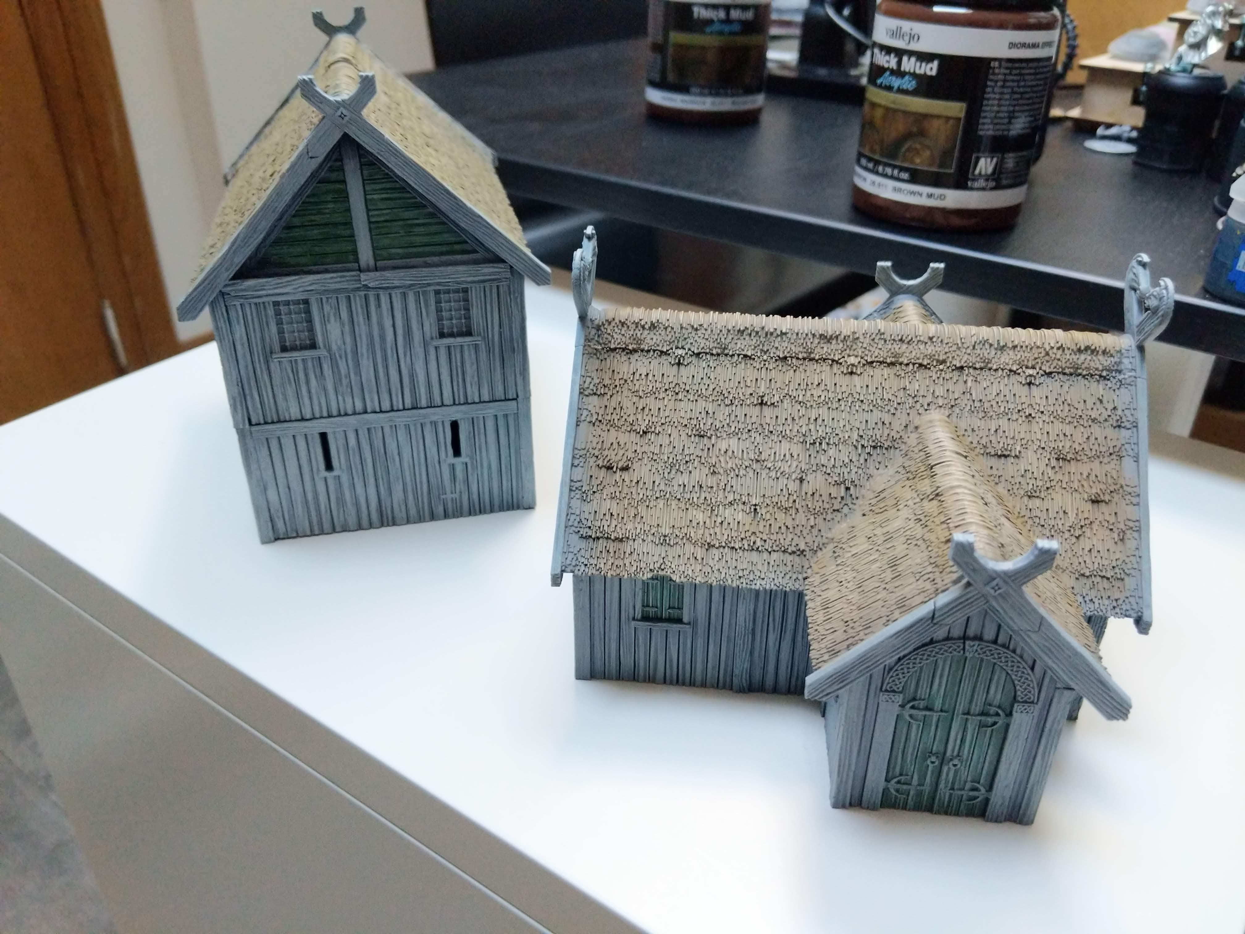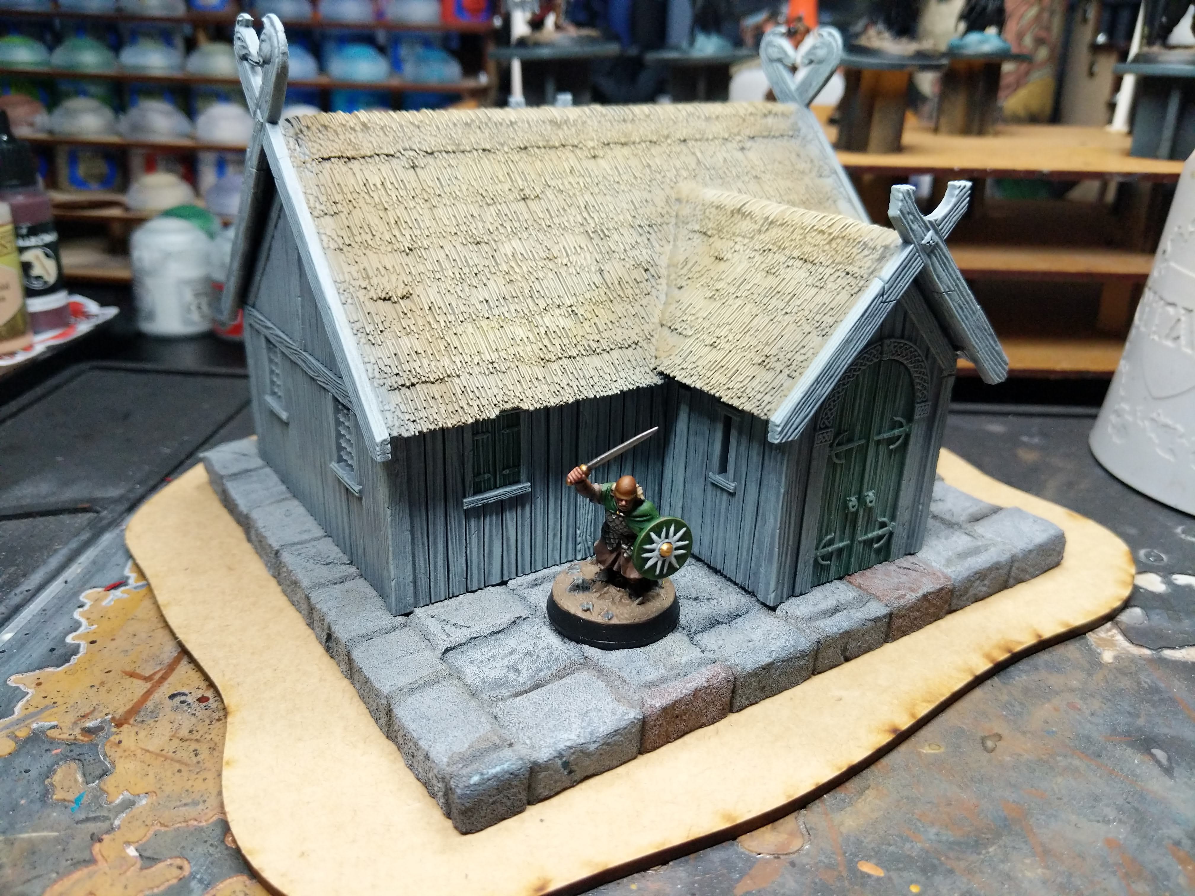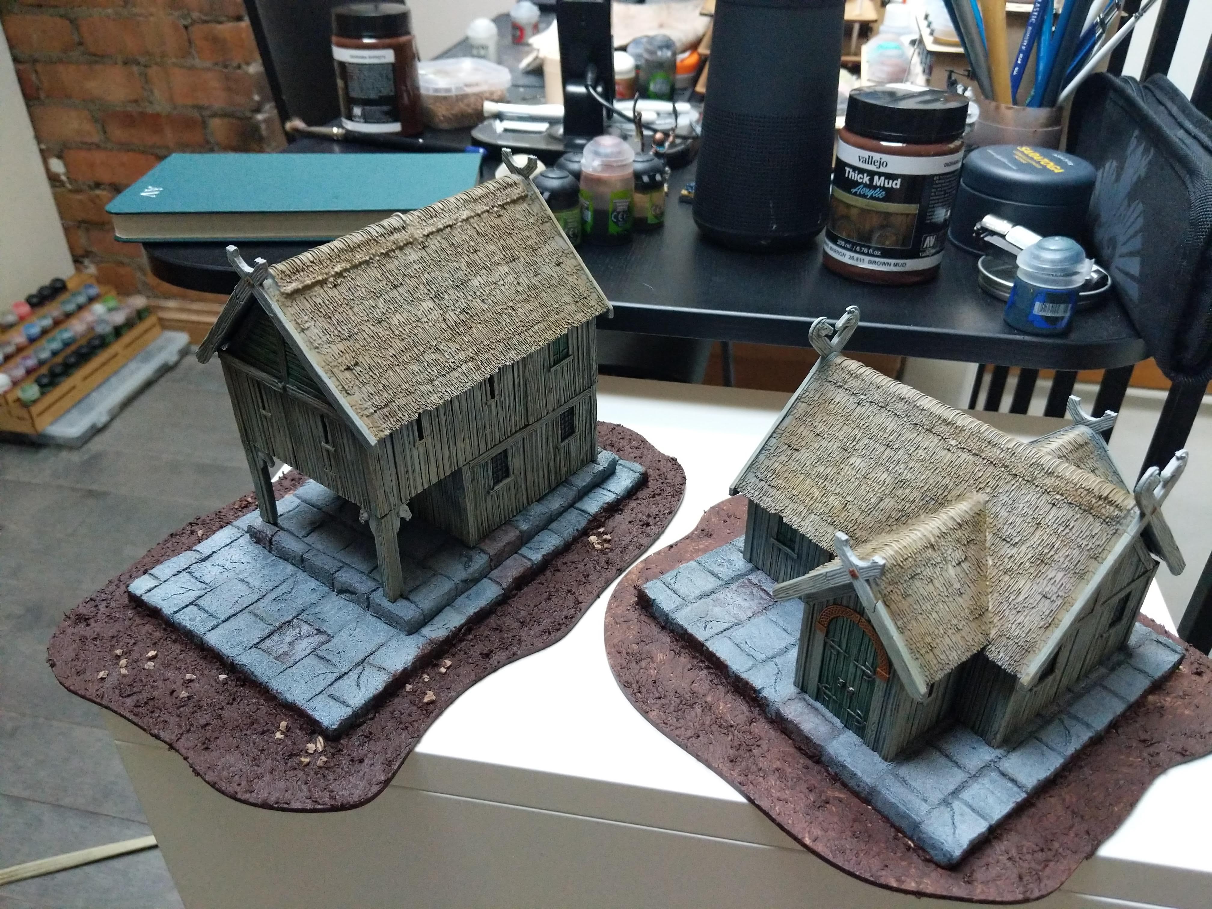 Two of the Rohan Houses are complete and the basing is just about done. The other five buildings have been primed and basecoated. Now that I’ve figured out the paint scheme, I should be able to get those completed pretty quick. I took inspiration from the fantastic Zorpazorp woodgrain and thatch tutorial and I am happy with the results. I’m trying to not lose sight that these are terrain pieces and do not require my typical, high-detail approach to painting. Status of the buildings is: