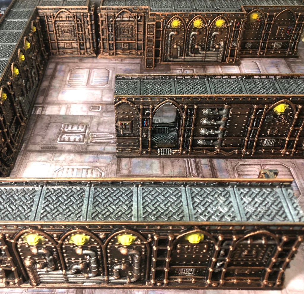 I also started making some progress on staring out some painting on some of the 3D Printed terrain features. Here are a few photos of the industrial style “Kill Zone” terrain from Printable Scenery. These were painted with some quick drybrush of metallic bronze and silvers. I touched up some reds and blues for switches and lights and added a glowing yellow to the wall lights. All in all, I think I looks pretty good and the rest should paint up pretty fast.