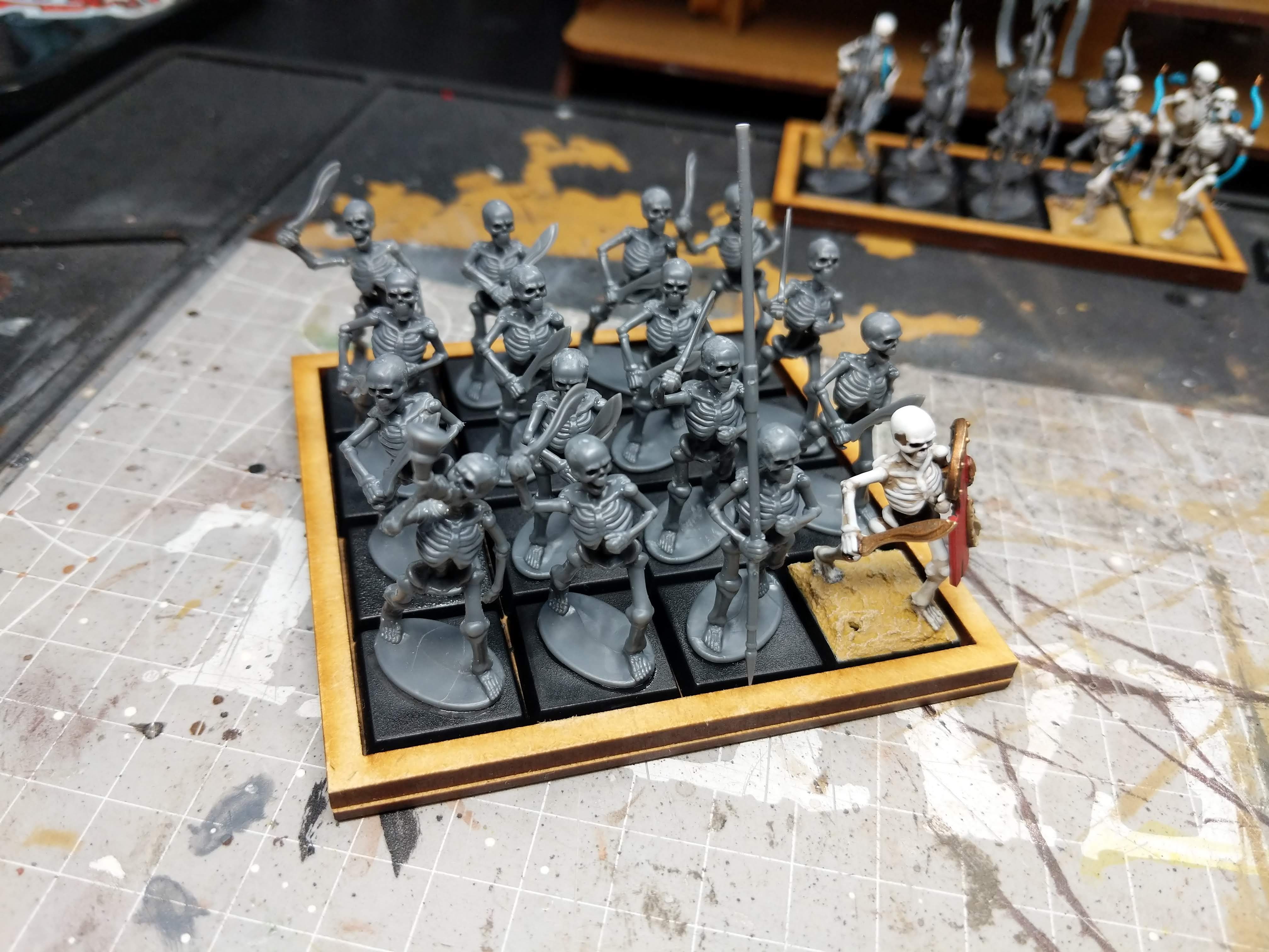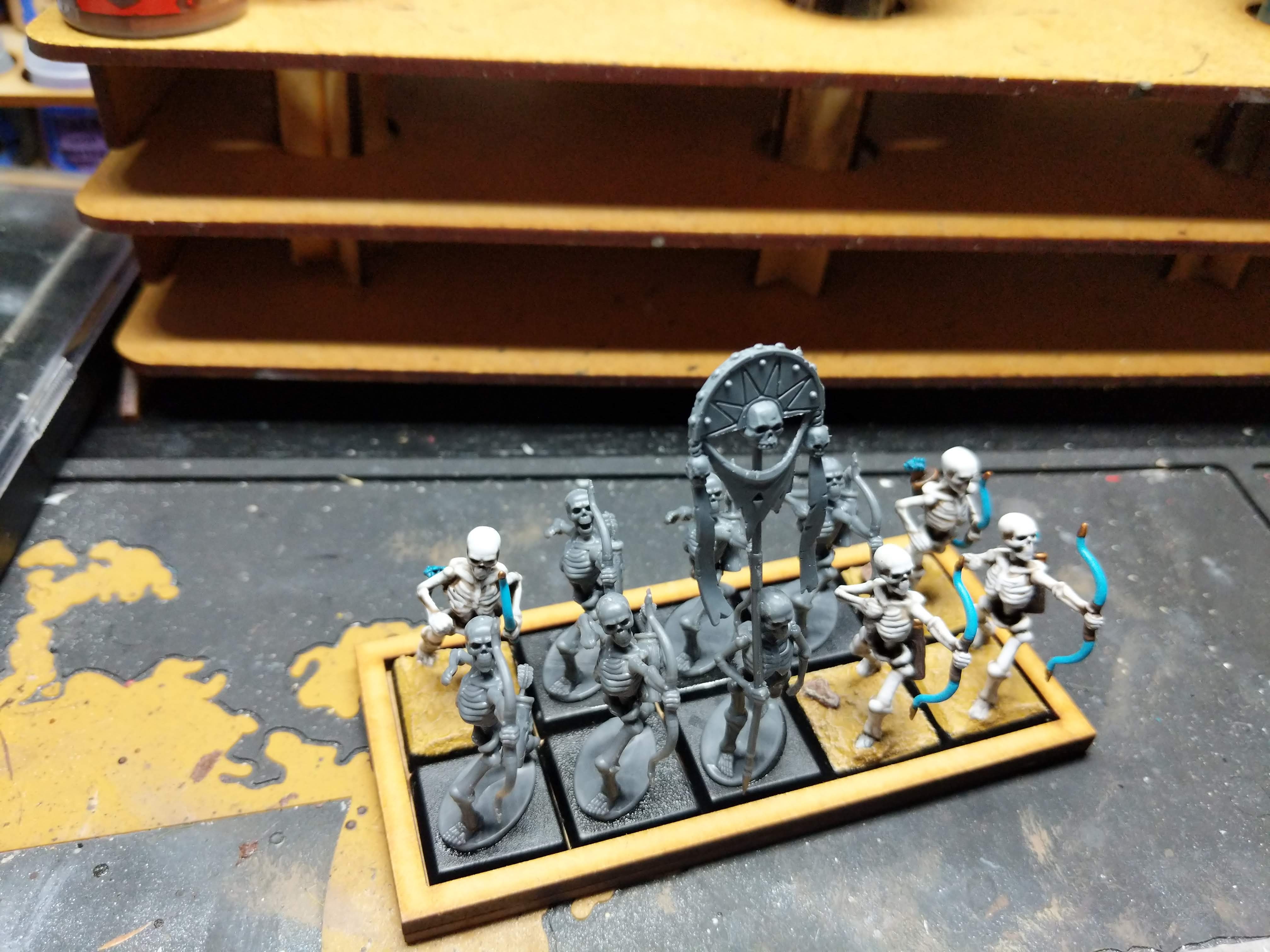 Two more purchases for the slow-burn Tomb Kings project – a set of four Wargames Atlantic Skeleton sprues and a collection of Tomb Kings bits (heads, shields, banner toppers). With the new shipment of skellies, I was able to finish building the infantry units. We are now looking at: