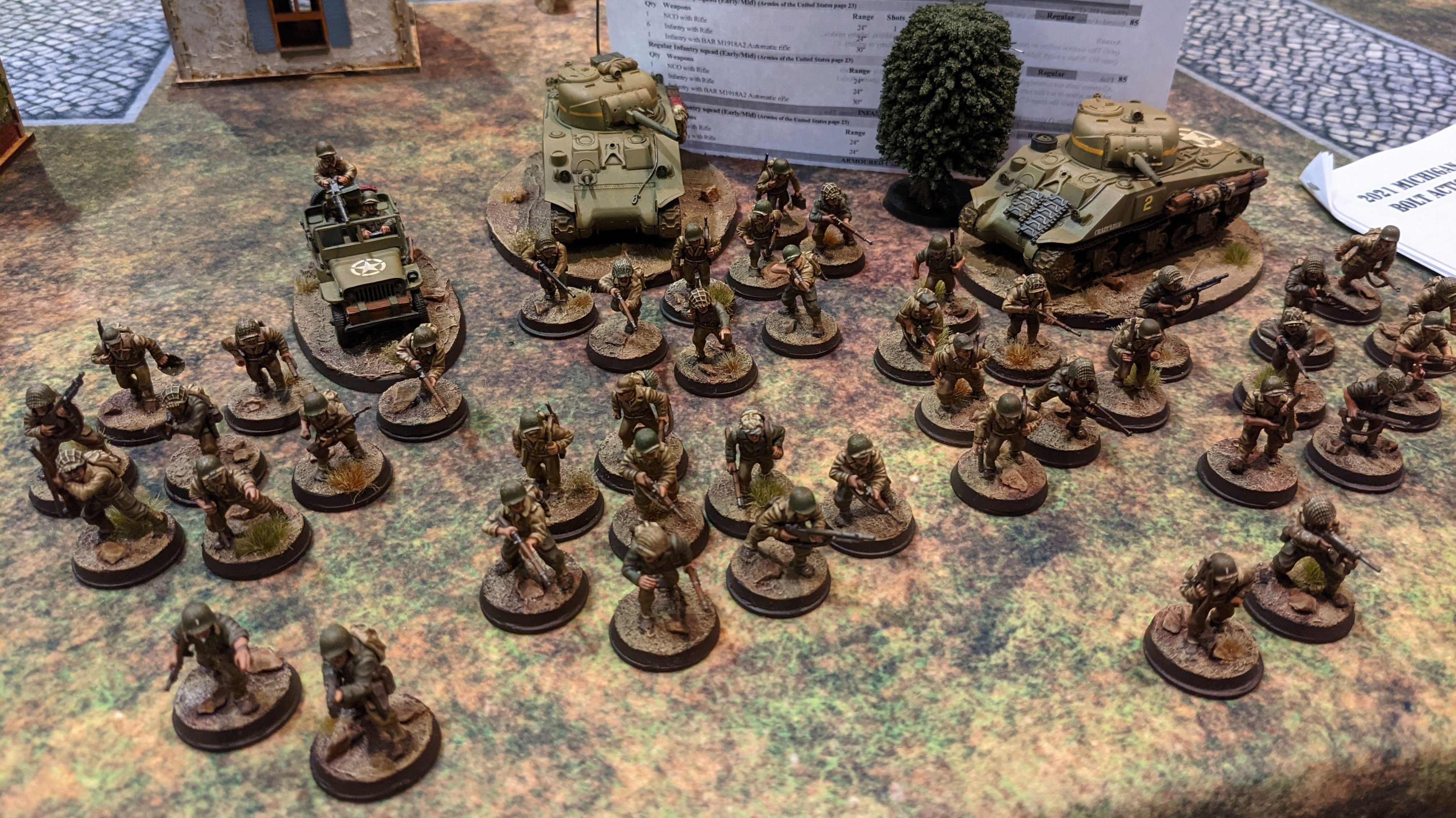 With the list restrictions in mind, I brought a force very different than what I would normally take to an event. What I landed on is this US Double Sherman army. This list was, without question, the most straight forward army I have ever played. There are no support teams, no indirect fire, no artillery, no tricks, nothing fancy. Just GIs, a Jeep, and two standard Sherman tanks – all Regs. My approach to each game was the same – Fire & Maneuver. This is basically a ‘rush’ list. Throw it all forward, blasting away as we go. And after three games, I really enjoyed it! There are a few tweaks I want to make (more BARs, add a Mortar) but the list worked much better than I thought it would.
