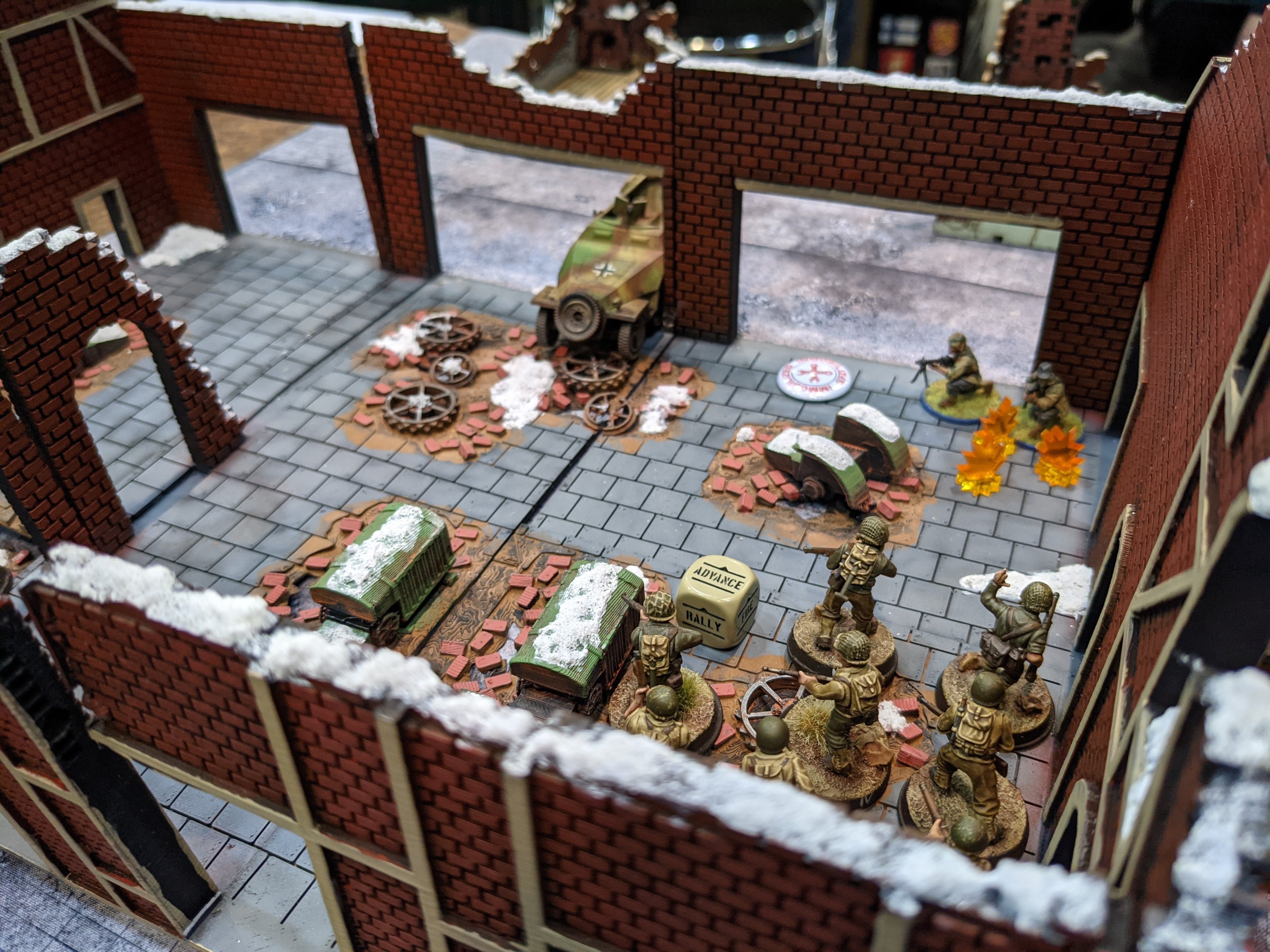 – The Battle for the Factory. Holy hell. It took almost half my army to get those Germans out of the factory. They really didn’t want to give it up. Pictured above are Scott’s two remaining infantry supported by an empty MMG half-track. My squad would die to the man in close combat against those two Germans and only managed to kill one. I then assaulted again with my Lt who was also cut down in close combat. It was a charnel house. I brought in a third infantry squad to take out the last remaining German, but the game ended before they could charge. But, honestly, with how the combats were going, that squad would have been cut down by this lone solider as well.