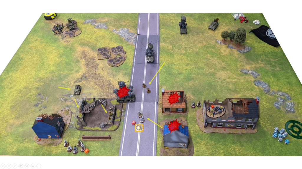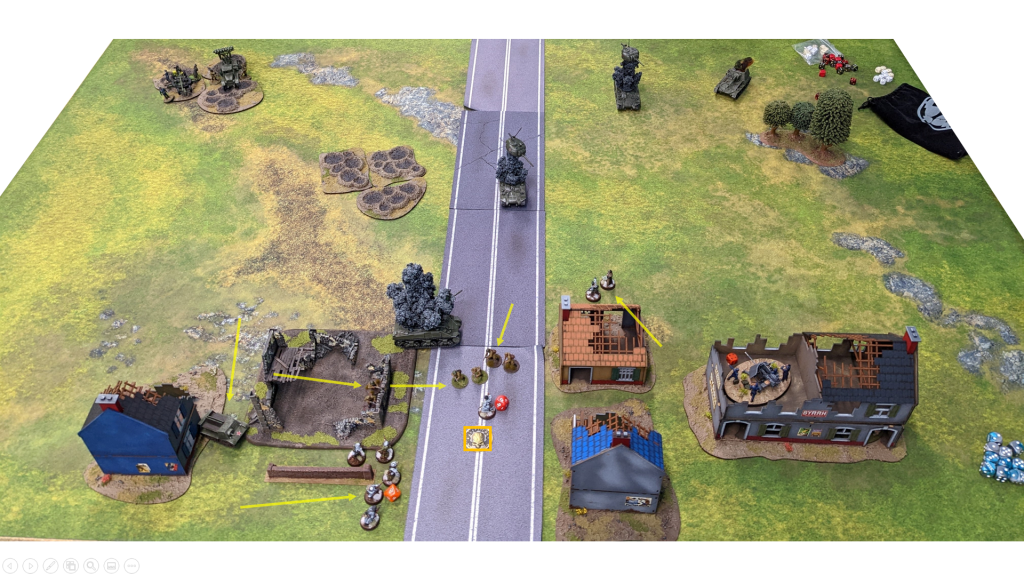 - German units moving on the Objective – Two Grenadier Squads (one with only one man remaining), and the Lt.