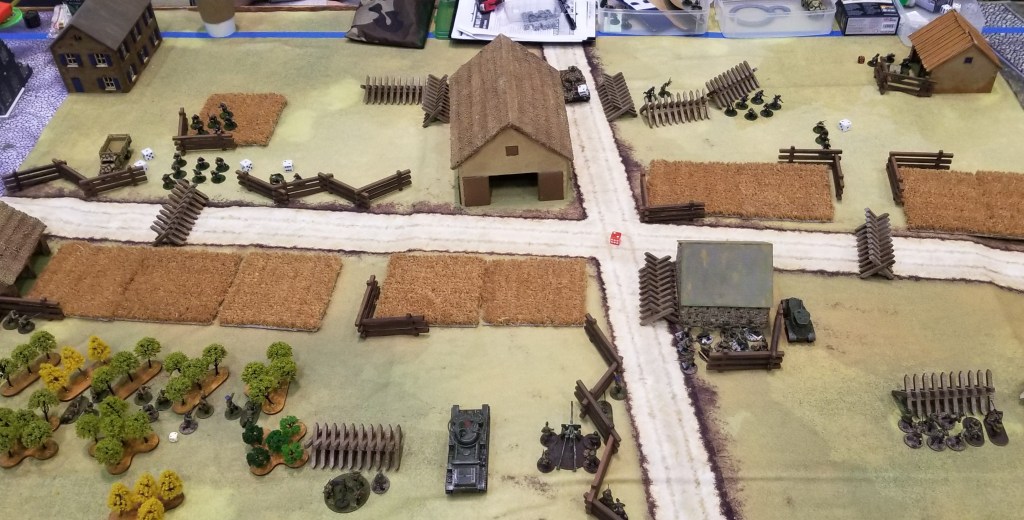 Prep Bombardment, Reserves, Outflanking, Forward Deployment, and a straight-up kill point match! The board was yet another Warlord board, with fields, fences, a few barns and sheds, tank traps, and two houses. We quickly established terrain and set about deployment. Ryan kept an Sd.Kfz 222 in outflank and I opted to throw everything on the table. I’ve seen Ryan before at local tournaments and events, but never actually played him in any Bolt Action. With both of us 0-2 on the day so far, this was to avoid the dreaded “Wooden Spoon” award.