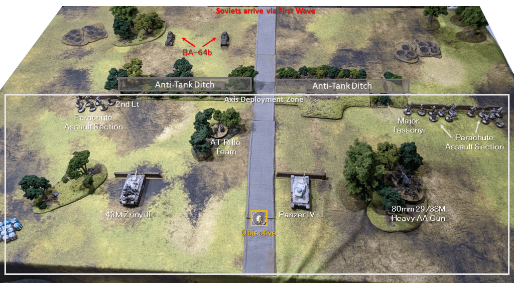 The battlefield is something we have not seen before – a wall of impassible terrain running across the middle of the table (with a road going through it). This would force Joe’s attacking force to either cut down the middle or go wide on the flanks. I deployed my defenders accordingly. Covering the road was my Panzer IV and AT Rifle Team. On the Right two squads of Parachute Assault infantry (each with x2 Panzerfaust and an LMG), with the Heavy AT Gun backing them up. On the left, a single Parachute Assault Section and the venerable Zrinyi II. I wanted to keep both Tanks within range of the Objective to contest any Soviet units and keep the Infantry far enough forward to fire at any Soviet units moving around the flanks.