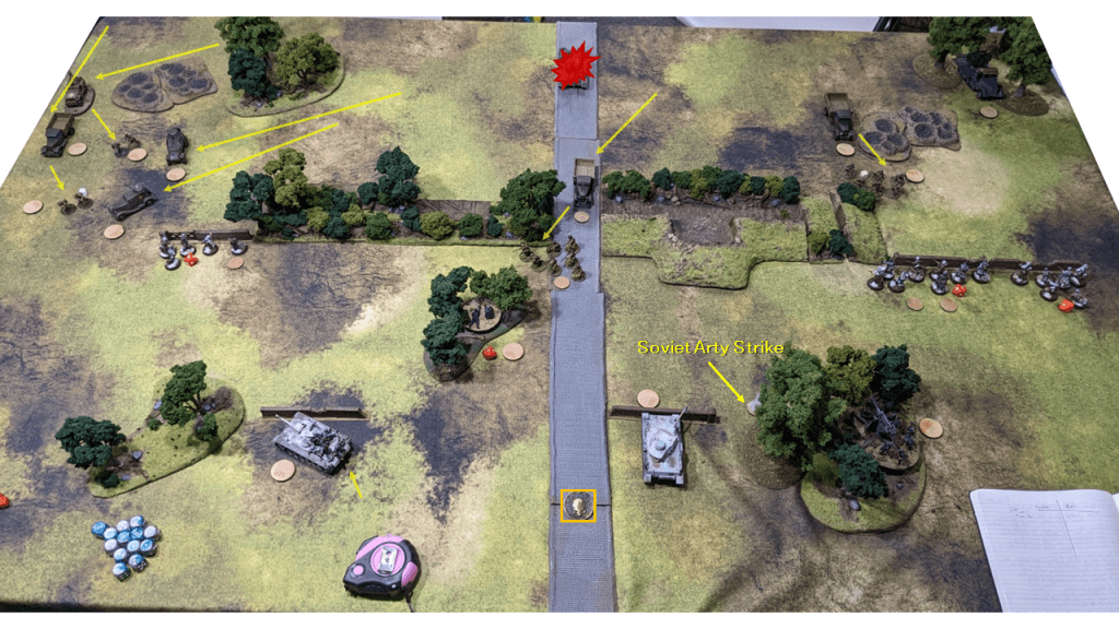 - Andrew’s Panzer IV had just a single Pin from the Soviet Artillery Strike failed it’s Order Test! This stopped Andrew from taking a critical Heavy AT shot at Joe’s vehicles in the Defender Deployment Zone each worth a whopping 3 VPs.