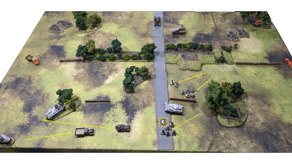 - Note on the terrain – the two groupings of craters are Anti-tank Minefields deployed by the Axis defenders. There is an impassive Anti-Tank Ditch that runs 18″ to the left and right of the road. The ditch provides no cover and does not block line of sight.