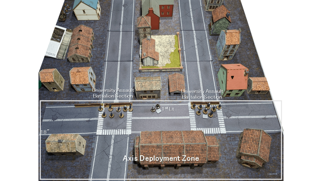 - Andrew’s platoon also granted d3 6″ linear obstacles (hard cover) set up anywhere in the Axis Deployment Zone. Those walls were set up on the roads, at the front of the Deployment Zone.