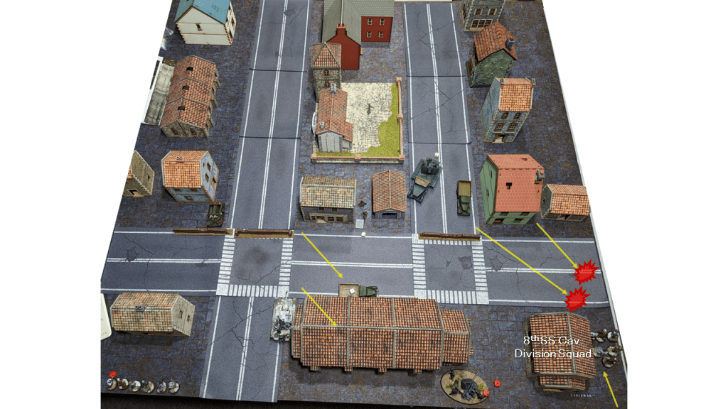 - A squad of 8th SS Cavalry entered from Reserve and took up position in the building on the left flank. The squad lost one man on the way in due to Ambush fire from a Soviet Bren Carrier.
