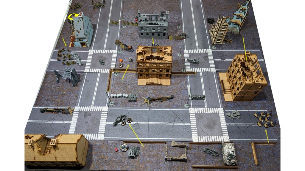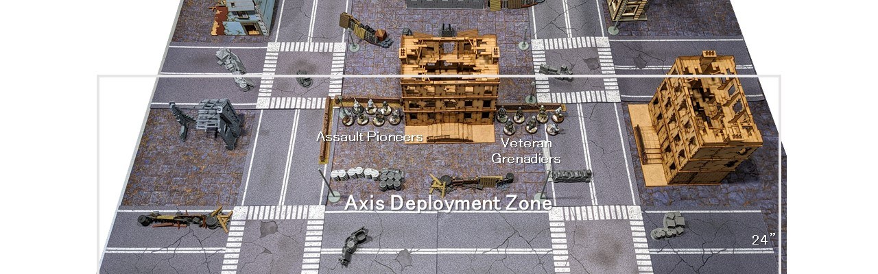 - Andrew’s platoon also granted d3 6″ linear obstacles (hard cover) set up anywhere in the Axis Deployment Zone. Those walls were set up on the immediate left and right of the Frontline Aid Post.