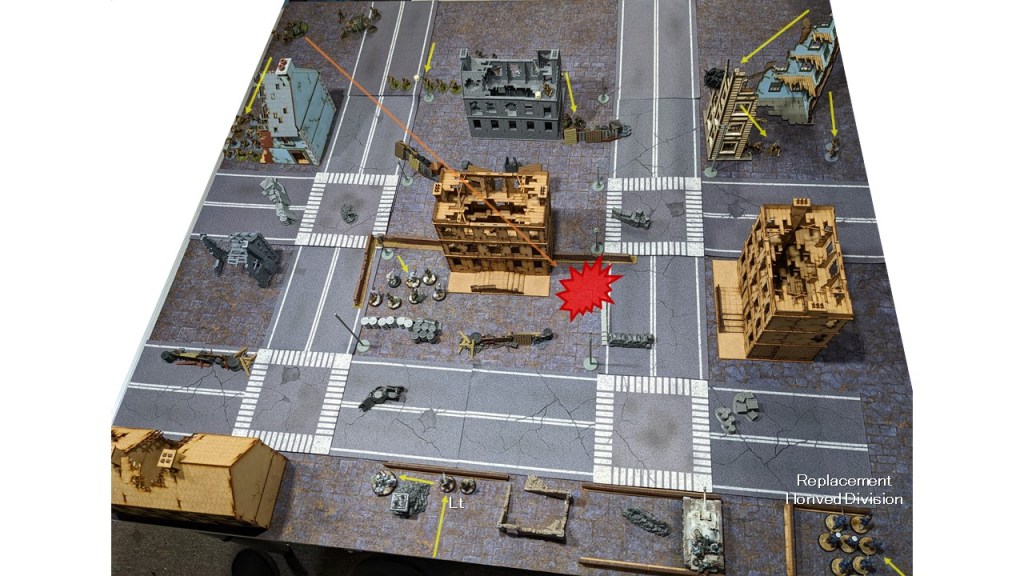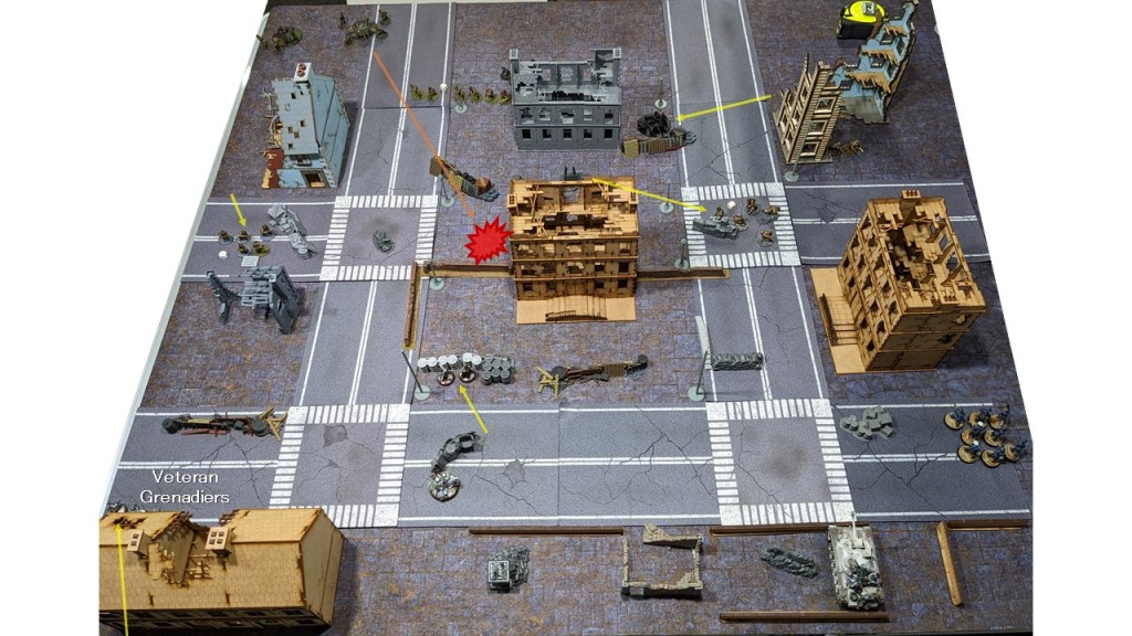 With a Frontline Aid Post right in the middle of my defensive line, I felt confident that my two Vet. units could handle any small arms fire. And if not? I have the StuH and two more infantry units in Reserve to fill the gaps. This is our second 4×4′ urban assault game and I have a chance to bring the Campaign back to a tie score. No matter the outcome, this is already shaping up to be an excellent game. – Andrew