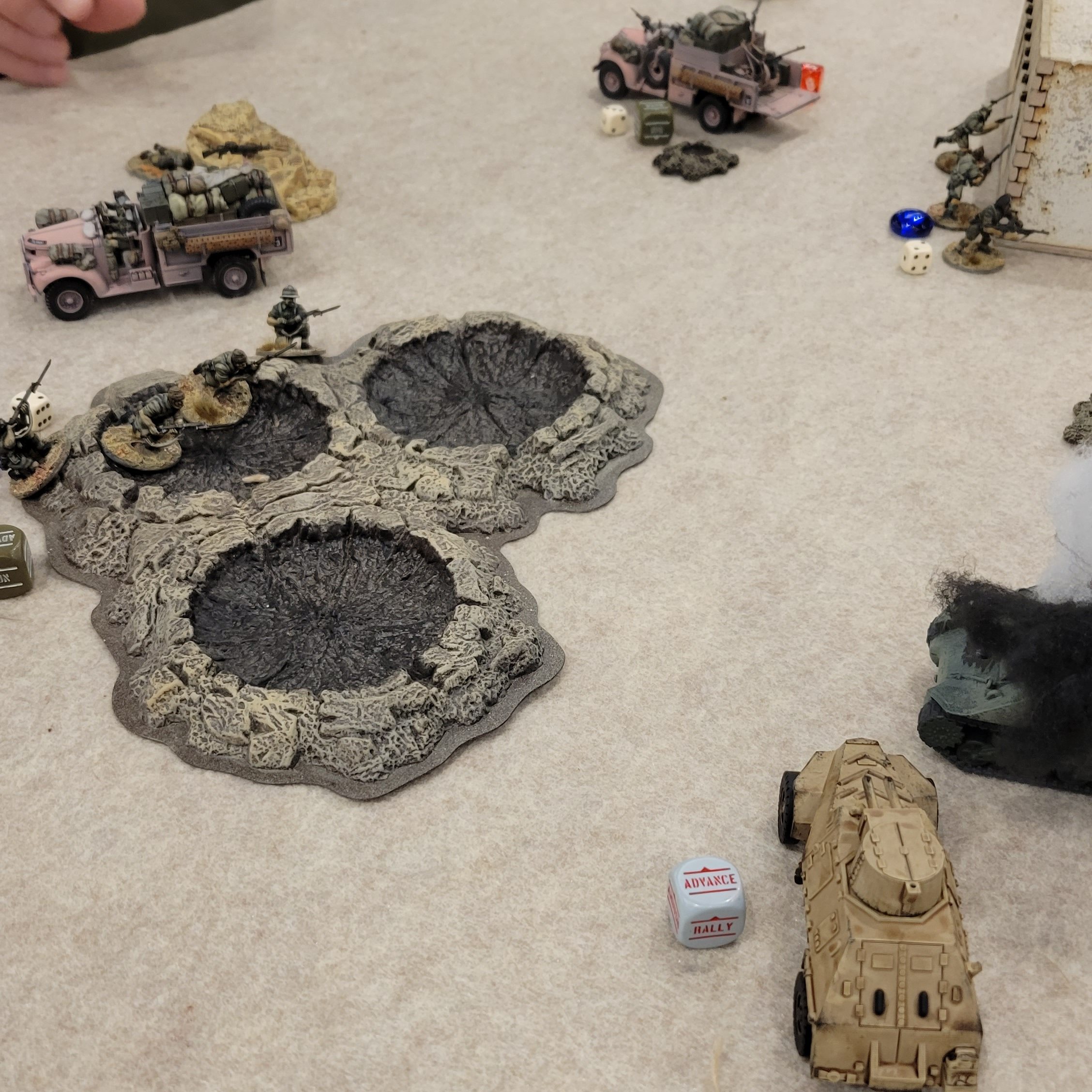 The units selected to airdrop could not be vehicles, and since both Al and I had four vehicles in our lists, there wasn’t much room for flexibility. I dropped my four infantry sections and my Lt, leaving my Artillery and vehicles in Reserve. Al dropped his infantry, Lt, and Artillery, leaving his Marksman and vehicles in Reserve. Our airdropped units didn’t scatter too dramatically. My infantry ended up fairly evenly spread across the table, putting me in a position to advance on all three objectives. Al concentrated his drops in one corner, but one of his 25-pounders somehow dropped straight into a building near the right-side objective, which meant it was stuck there for the rest of the game.