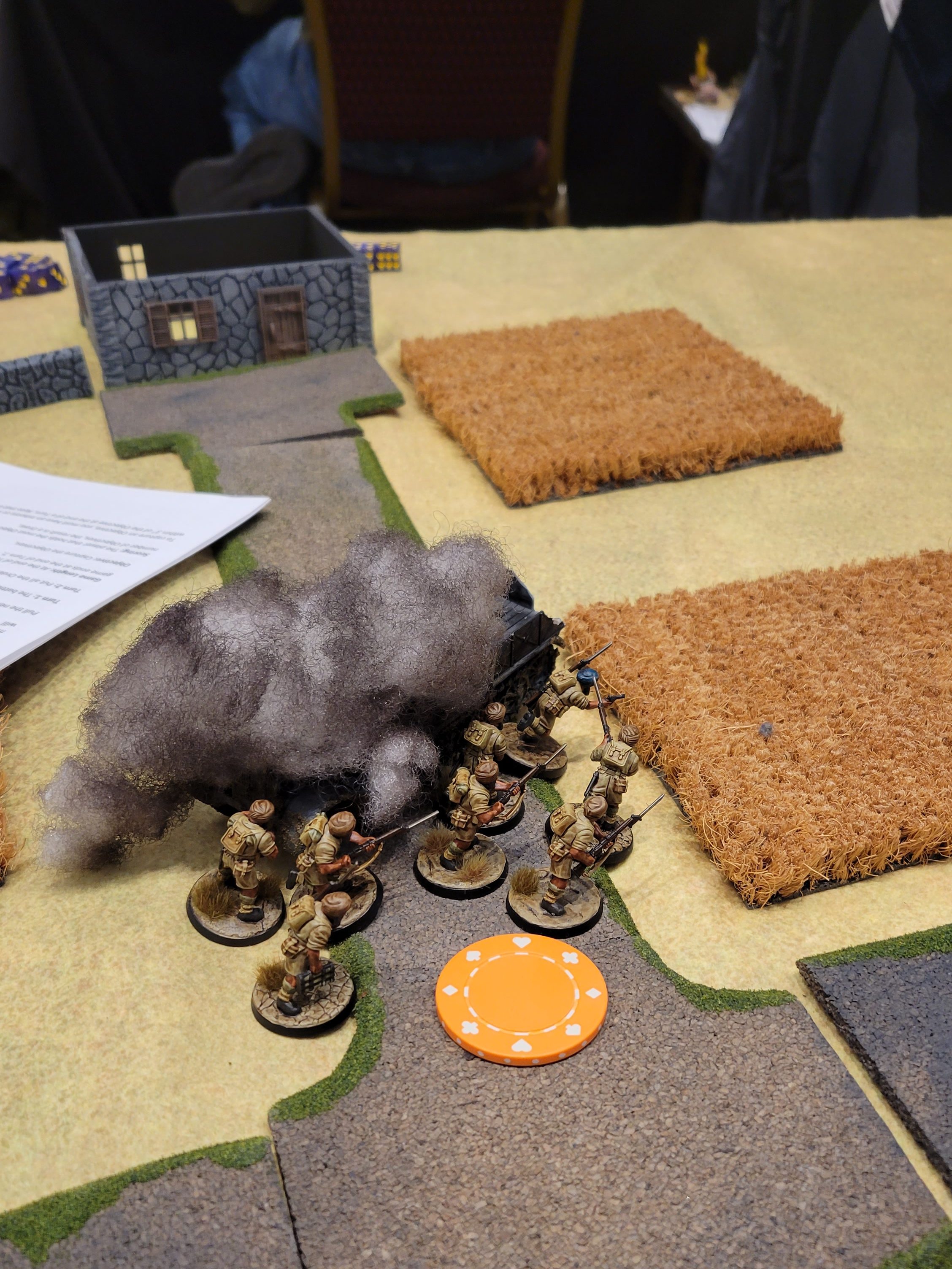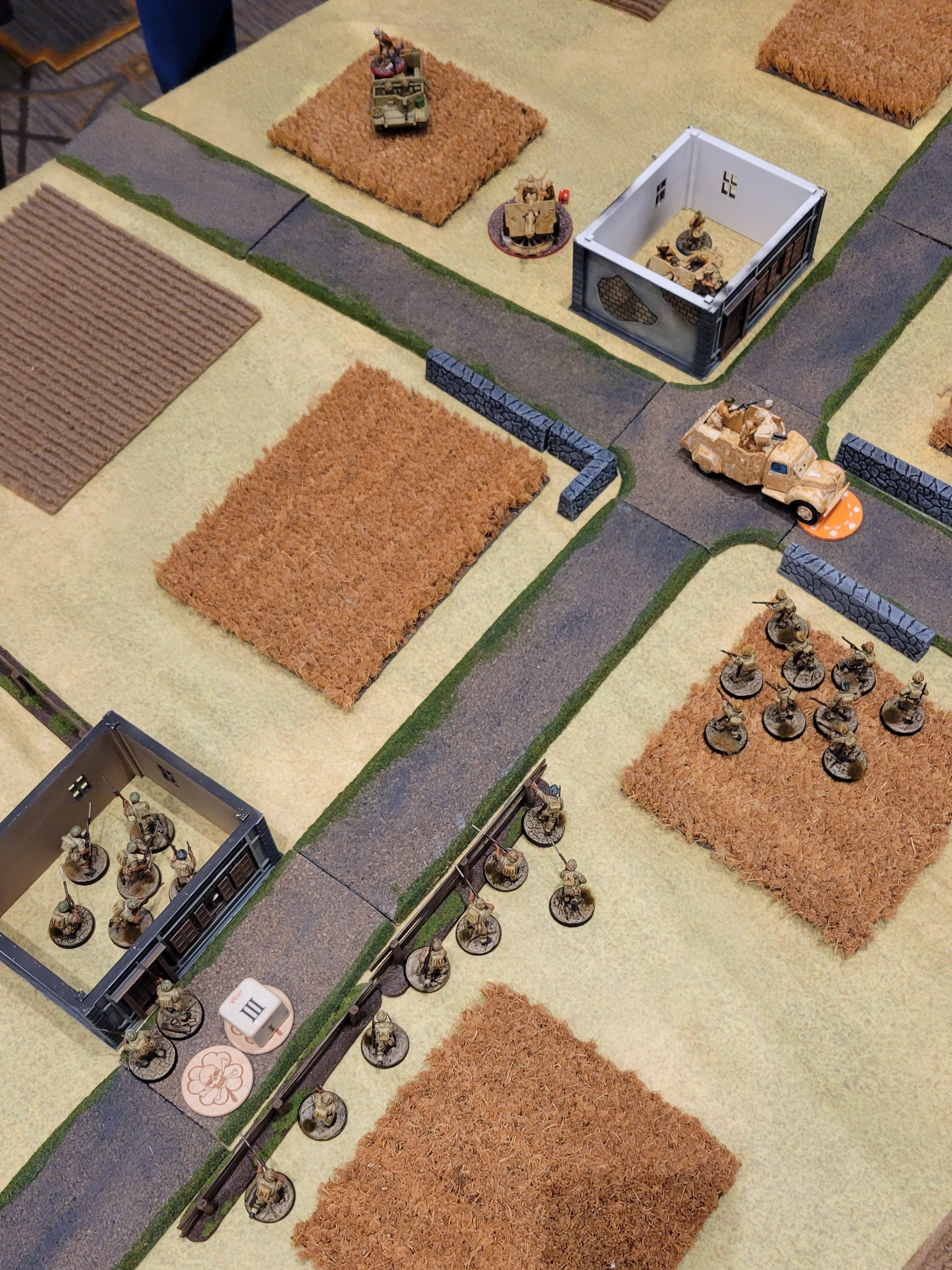 The mission for Game 3 was “FUBAR!”. Our entire armies were deployed on the table in deployment zones that were only 12″ apart. After deployment we also put a Pin marker on to two enemy units, removed the NCO from two enemy units, and placed three of our own units Down for Turn 1. We scored 1 VP for each enemy unit destroyed and additional VPs for pins on enemy units at the end of the game.