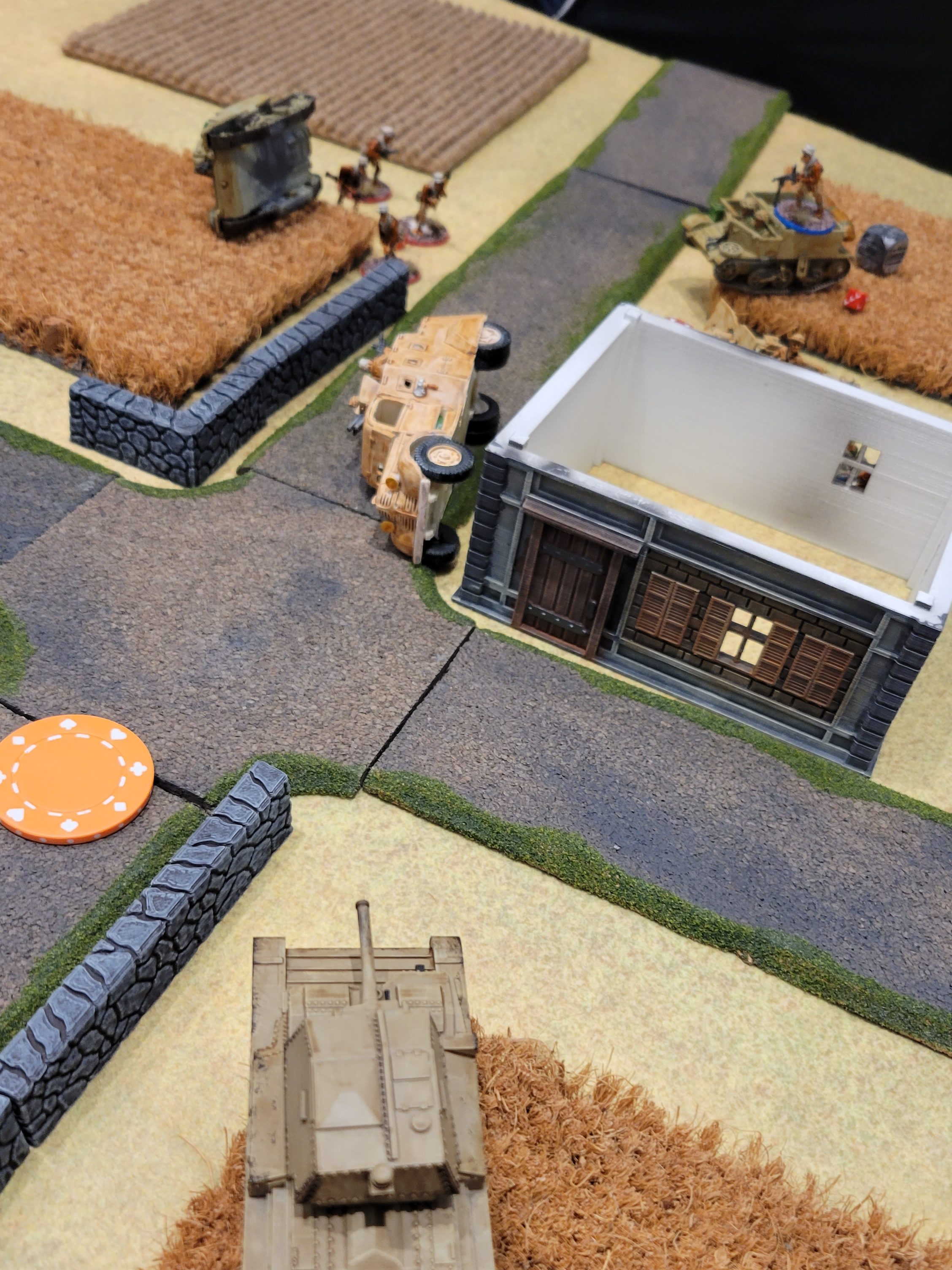 In Turn 3 Al’s infantry climbed aboard the Bren Carriers and they started advancing towards the hotly contested right-side objective. The advance of my armored vehicles forced Al’s Tanake to retreat back towards his Artillery, a well-considered move that would prove unfortunately costly for my opponent. Disaster struck on Turn 4 when a failed order test turned FUBAR and resulted in Al’s remaining 25-pounder taking a point-blank shot into the side of his own Tanake, destroying the vehicle. Soon after, one of my Tanks destroyed one of his Bren Carriers, and at that point there was little Al could do to salvage the game. My forces controlled all three objectives and it would have been near impossible for Al to contest or claim them for his own. We called the game early after a hard-fought battle and a good time for both players.