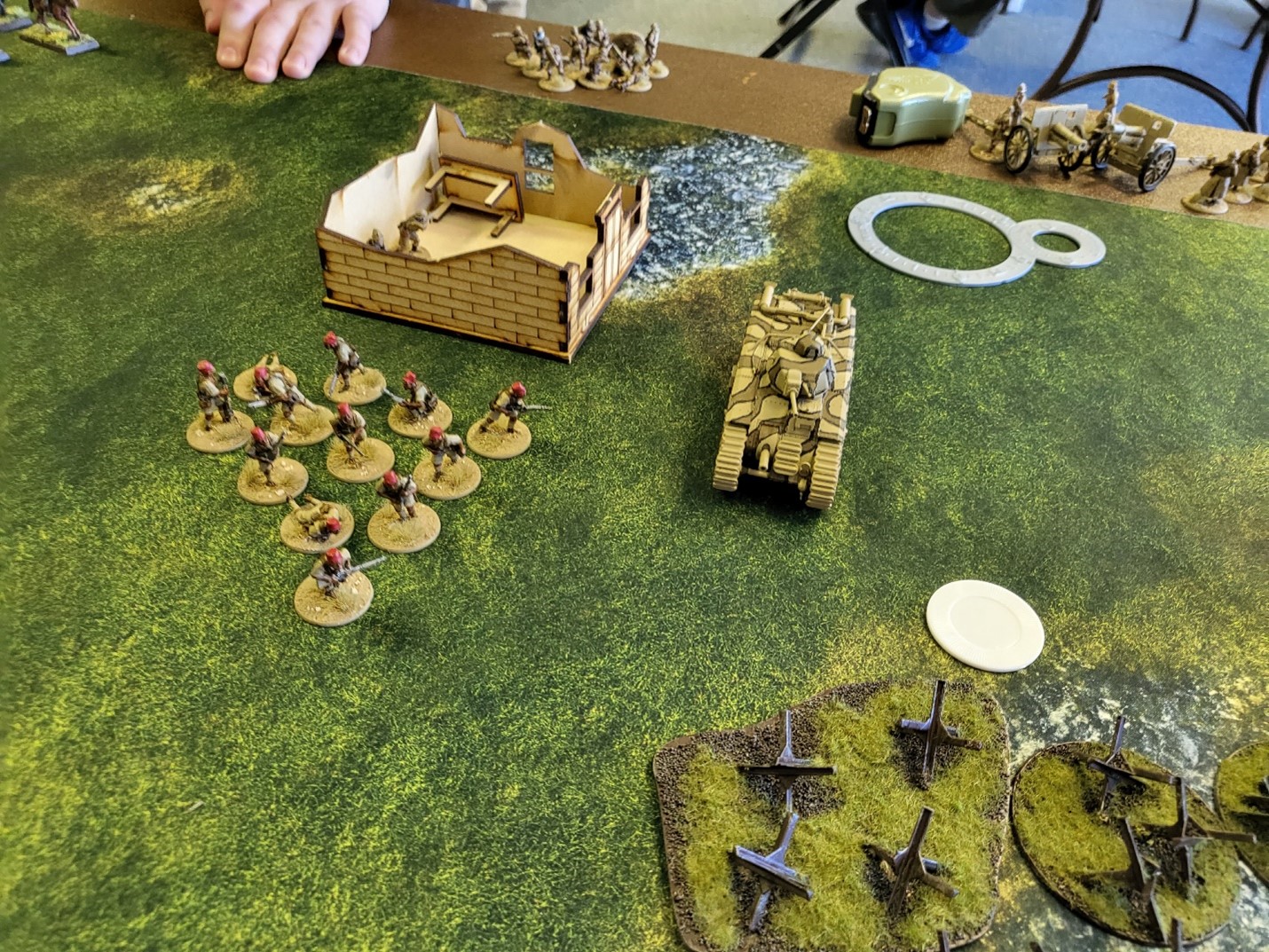 My AT Rifle Team after losing a man to the Armored Car’s machine gun is unfazed and moves to secure the Objective in my backfield behind the L6/40 hull and out of sight from the Char.