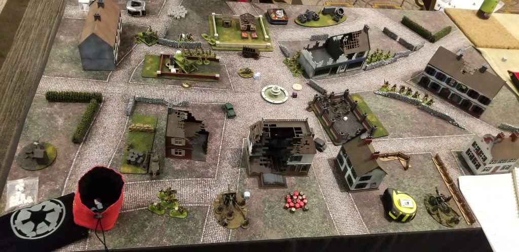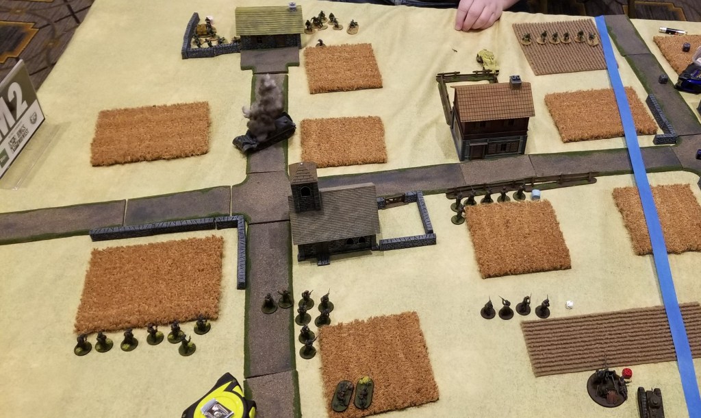 Not putting the Arty into the Scattered Drop was a big mistake. They lost multiple rounds of shooting that could have either killed Rob’s troops or at least kept them at bay or forced them to recce away for a turn. The saving grace for me was the Motorcycles were able to force Rob to waste around 7-8 activations trying to shoot them. If those dice were put towards other parts of my force, the game would’ve been over much sooner.