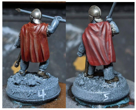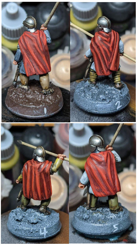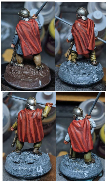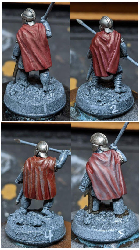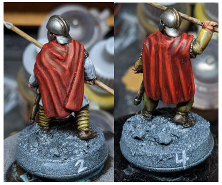 My objective was to test four different reds and find the most effective method to create a rich, deep crimson cloak – true to the Roman fashion. I did not alter or switch up my color choices or techniques once the basecoat was applied. Looking at the four completed cloaks, the Citadel Contrast Flesh Tearers Red (1) was both the easiest to apply (one coat coverage) and provided the most concentrated basecoat to build up further layers.