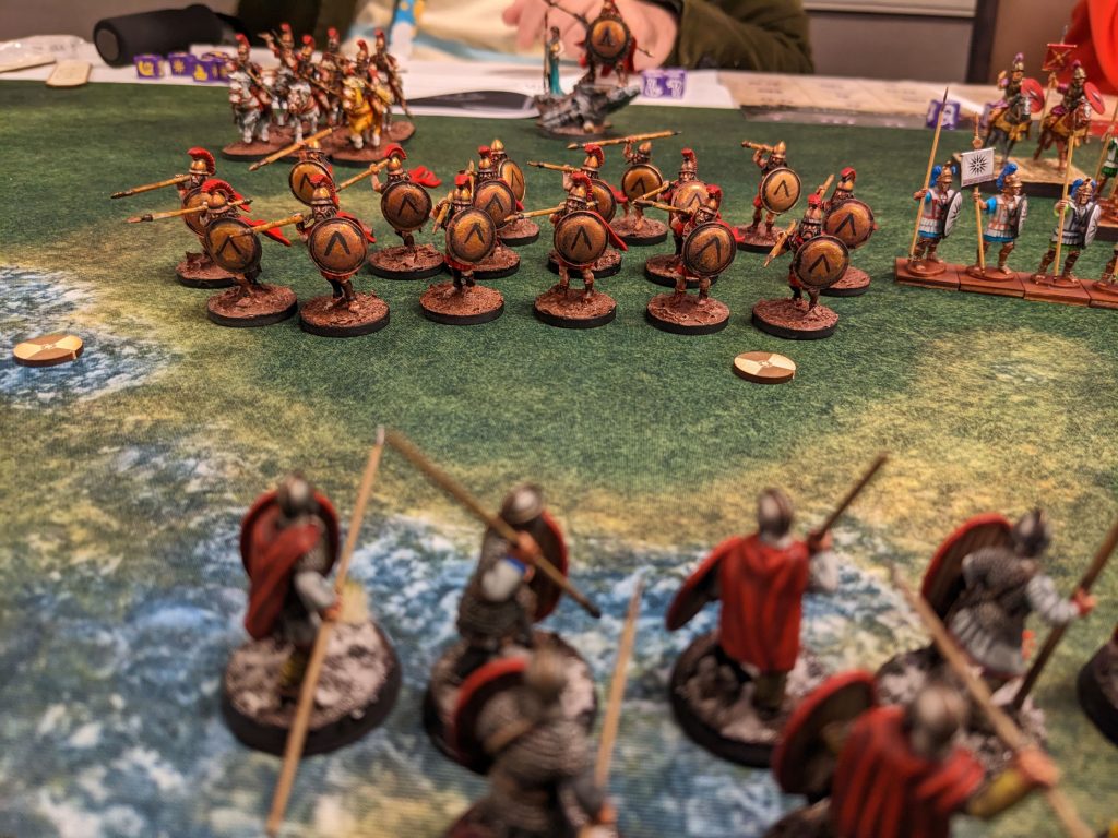 Ben’s highlight – We lined up our forces basically side by side, which put me against Macedonians while Andrew attempted to attack the Spartan lines. I learned the value of cavalry maneuverability very early in this one, as well as the importance of keeping your warband coherent, as I traded models in the middle but overextended my right flank and left a couple units in a position where they couldn’t really impact the center of the battle. I did have some glorious clashes with the Macedonian Hearthguard however!