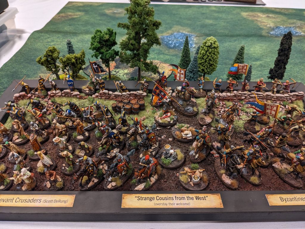 Andrew’s highlight – Ok wow. Firstly, Mark and Scott’s Warband was exceptionally painted. The photos do not do it justice. They walked away with Best Painted and it was well deserved. Now on to the battle. Mark kept his Byzantine forces formed in a tight square that my Romans failed to break. But on the other side of the table, the true battle was taking place. Ben charged with northern fury into Scott’s pilgrim rabble only to be thwarted again and again by their unshakable faith. There are several SAGA Abilities on the Crusader Battle Board that limit Pilgrim losses and boost their own fighting prowess. Needless to say, Ben’s warriors had no idea what they were in for.