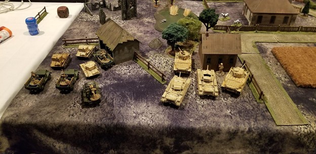Combined they had three Vickers Light Tank Mk VI C – Reg, Armor 7, Light AC with co-ax MMG, two A13 Cruiser MK IV Tanks with Light AT Guns and Armor 8, two Matilda IIs with Light AT Gun coax and Armor 9, Slow, four Trucks, three Maori infantry squads and an Engineer squad with a Flamethrower, and a Lt team. It was an enormous amount of firepower, and staring at it from across the table, we were worried.
