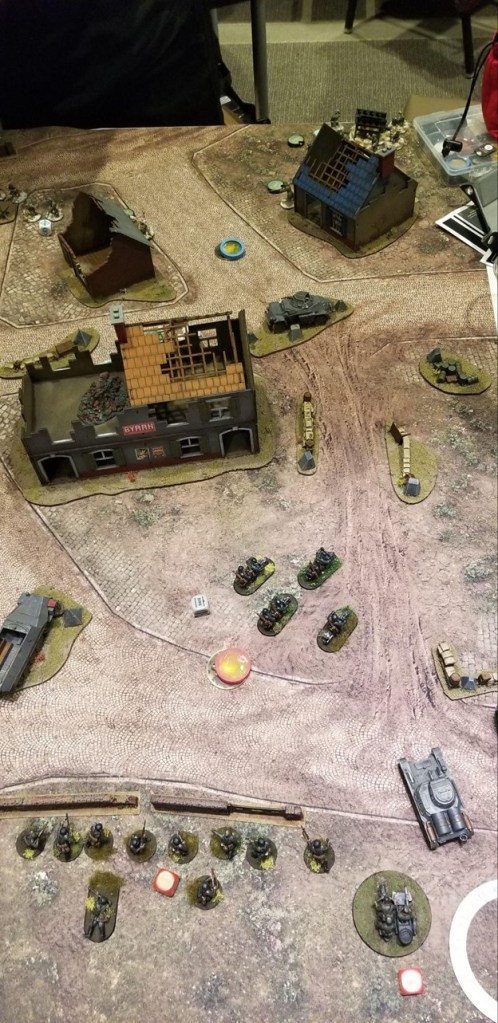 For our second game, we played the FUBAR mission. In this mission one player from each team deployed their entire army between 8 and 18 inches from their side, leaving only 12 inches between the opposing forces. The other player’s entire force arrived via First Wave. Once the deployed units were on the table each side suffered some additional Pins, some killed NCOs, and a few units were ordered Down for the first Turn.