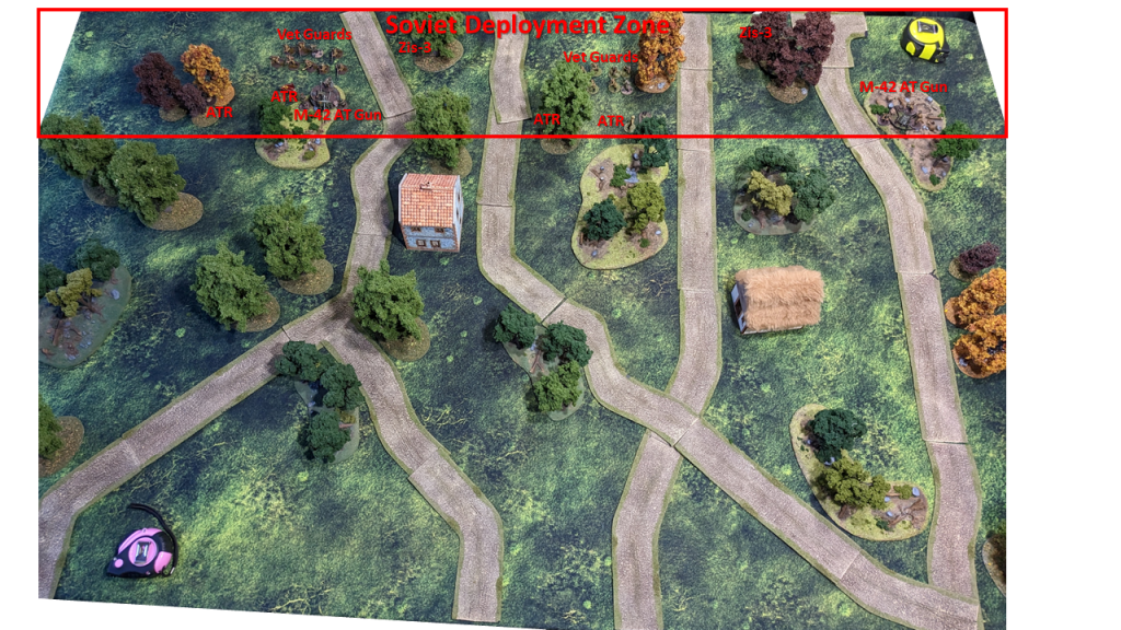 With my big assault guns in Reserve, I would have to just try and survive the Panzer’s initial onslaught. I set all four AT Guns along my deployment zone, fairly even across as I was first to deploy so I was at a tactical disadvantage. I had all my AT teams out and in good cover to try and blunt the Germans, and an infantry squad with Panzerfausts on each flank. Being spread out meant I wasn’t in a strong position at first, but it would allow me to flex towards any direction that the Panzers might come from. I needed to just make it to turn two where my heavily armed and armored assault guns could come in and halt the fascist pigs.
