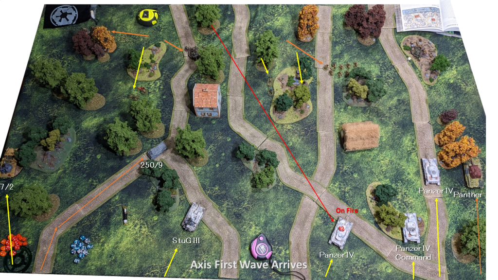 - The Panzer IV on the middle road, also looking to escape off the table, fails it’s Order Check and also backs away! After four turns of incredible Morale the Axis advance stalls out.