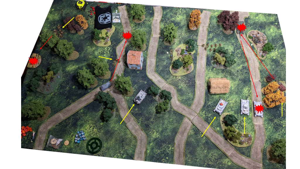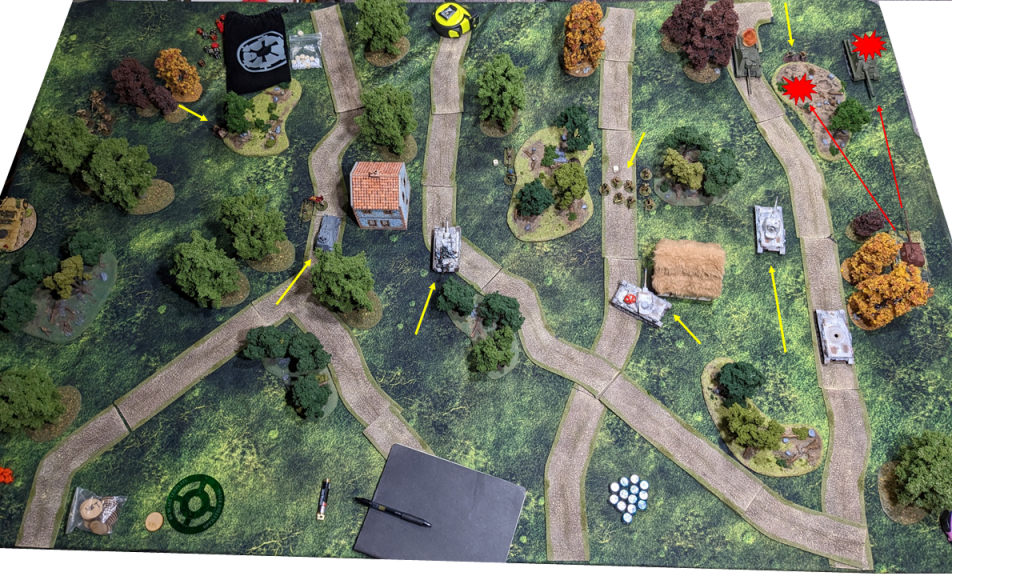 Joe’s Soviets broke the stalemate and dealt Andrew’s Axis the first major loss of the Campaign. Tonight was a chance for the Axis Commander to strike back! Operation Konrad I took our players outside of the city and back into the rural Hungarian hinterland. The table was almost enterally covered in trees with several unobstructed dirt roads running from the Axis side to the Soviet sides. After several brutal urban battles, a Tank War game out in the country promised to be a nice change of pace.
