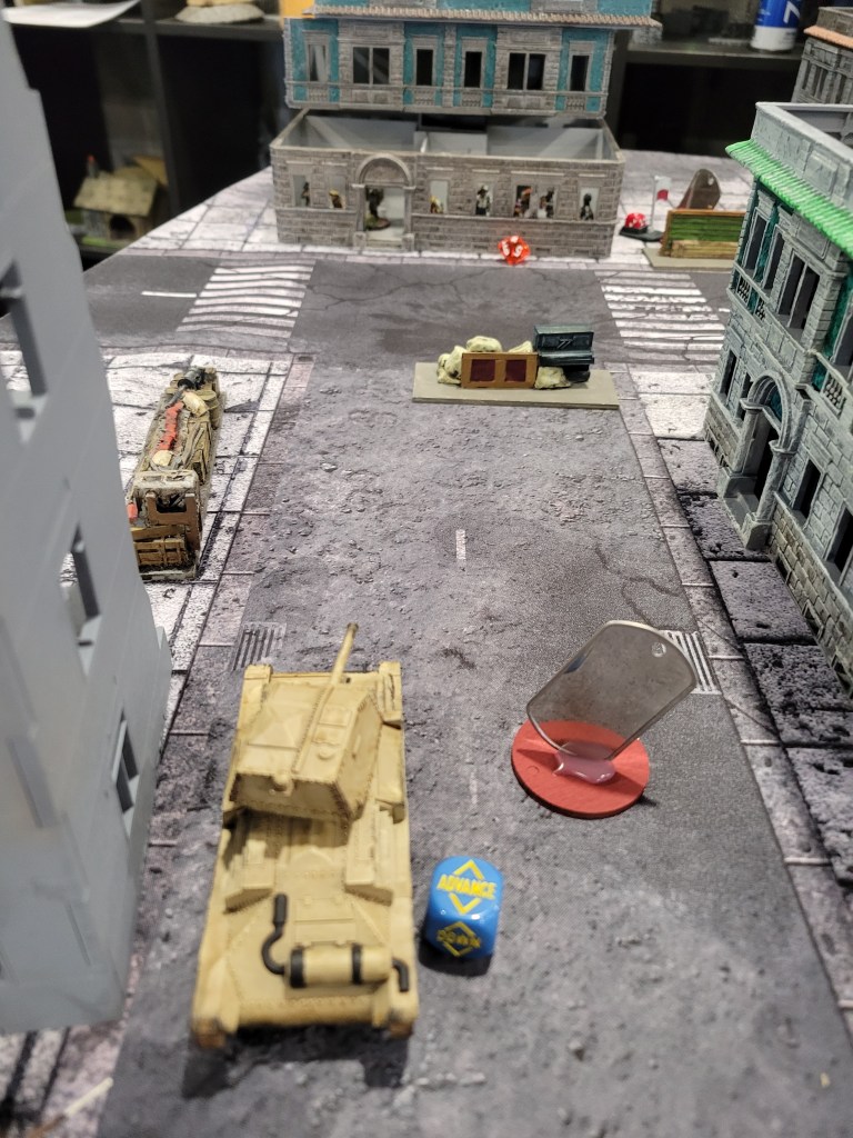 The table for this game was a crowded city map with lots of buildings, which I felt would be helpful in avoiding Adam’s Panther and allowing my Motorcycles and AEC Armored Car to quickly maneuver through the city streets.