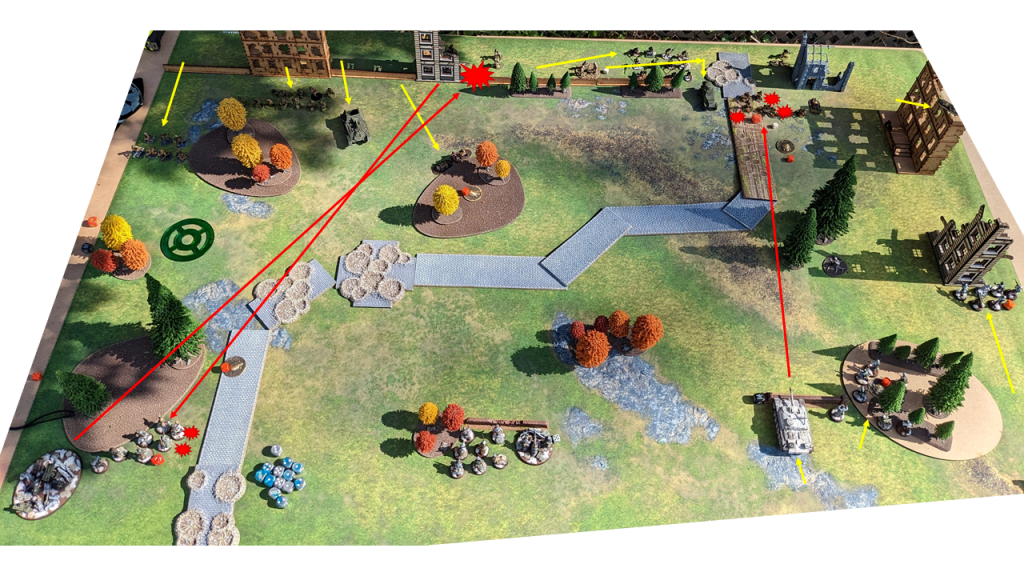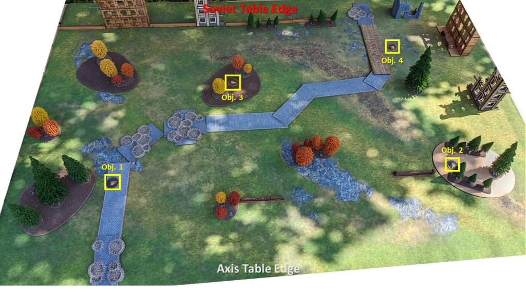 - Four objectives placed at the start of the game. When an infantry unit first moved within 3″ they must stop and search to discover what kind of supplies were hidden at the objective.