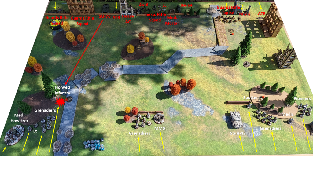 - The SU-76, holding position, misses a shot against the Grenadiers behind the wall in the middle.