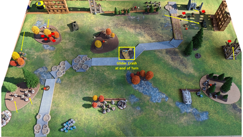 - Glider crash! The Glider crashed down 38″ off the right flank. This newly arrived objective is worth 6 VP. During the crash, the impact put two Pins onto the Soviet ATR Team by the middle woods.