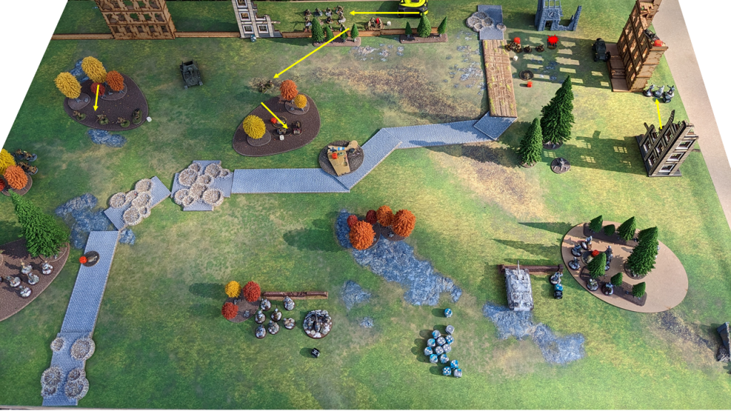 - In direct follow-up to Turn 2, the StuH again fires at the Guards Rifles. They hit the dirt but still take a hit. They are up to 4 Pins.