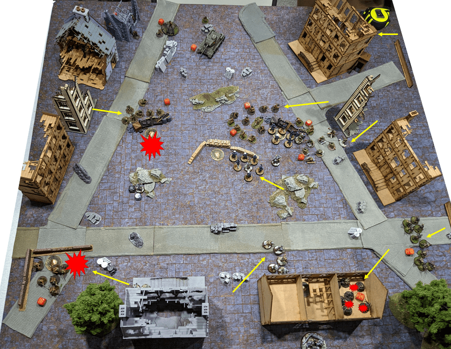 - Artillery Barrage arrived, 10″ blast, and delivered 2 Pins onto the Guards Rifles, 1 Pin on the Lt, 3 Pins and 4 kills on the Free Rifle Squad, 1 Pin on the Med. Mortar and 2 Pins on the second unit of Guards.